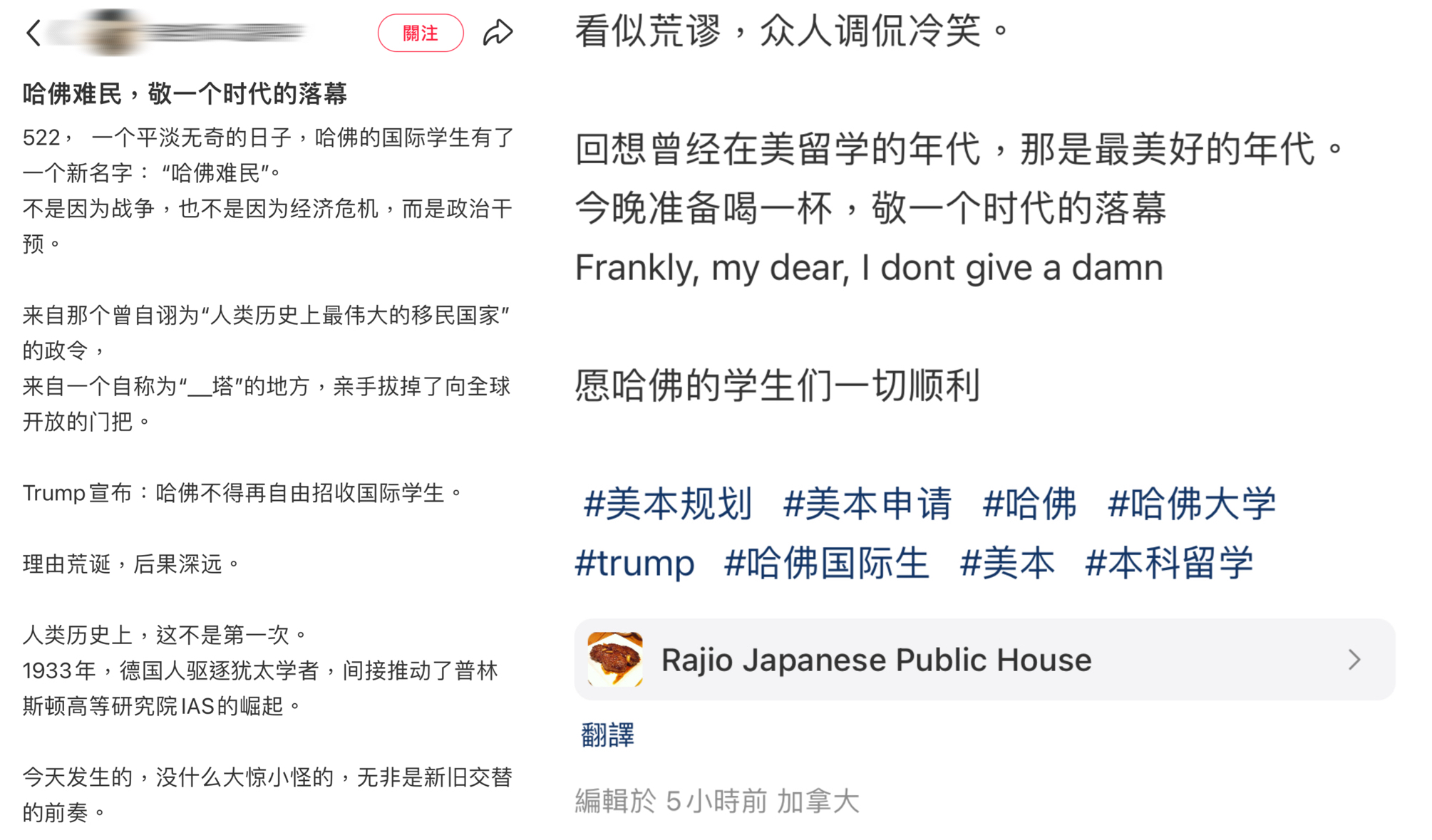該事件在社交平台上引起熱議,有不少哈佛在讀留學生發文稱自己成為了「哈佛難民」,一覺醒來竟面臨「失學」危機。更有已經畢業的人士「詩意大發」,以「哈佛難民,敬一個時代的落幕」為題,寫了一篇散文表達自己的看法。