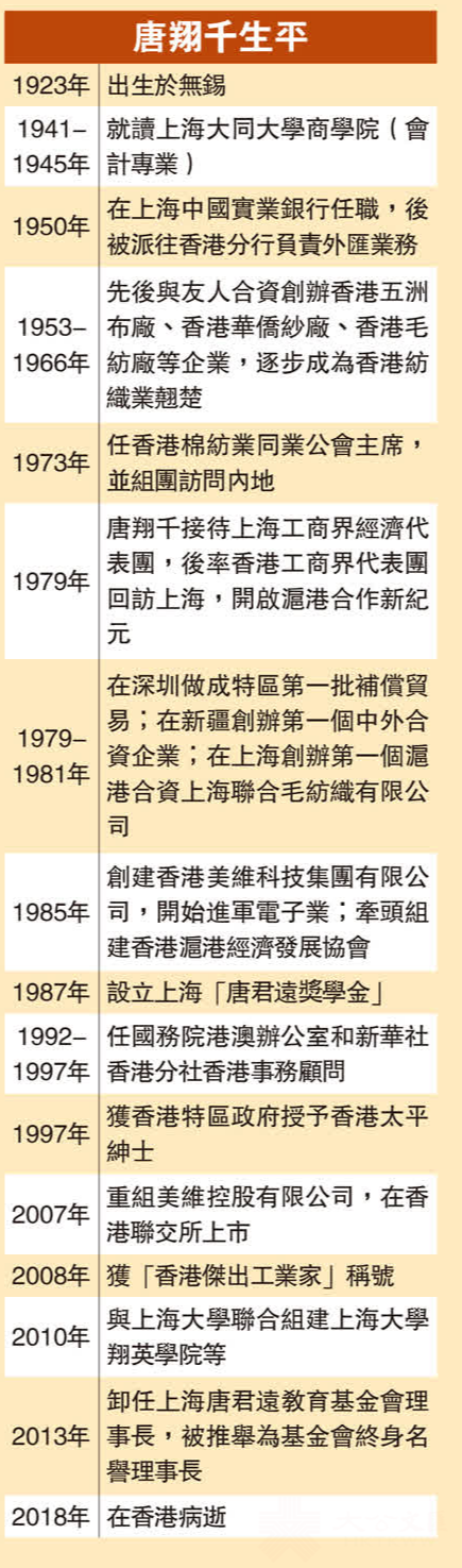 (大公報記者 彭子河)有「香港紡織大王」之稱,出身無錫紡織世家的愛國實業家唐翔千,早在上世紀50年代在香港創立紡織企業,見證了香港從轉口港轉型為工業城市的歷程。作為改革開放後首批投資內地的港商,唐翔千更領取了上海首張滬港合資企業執照。