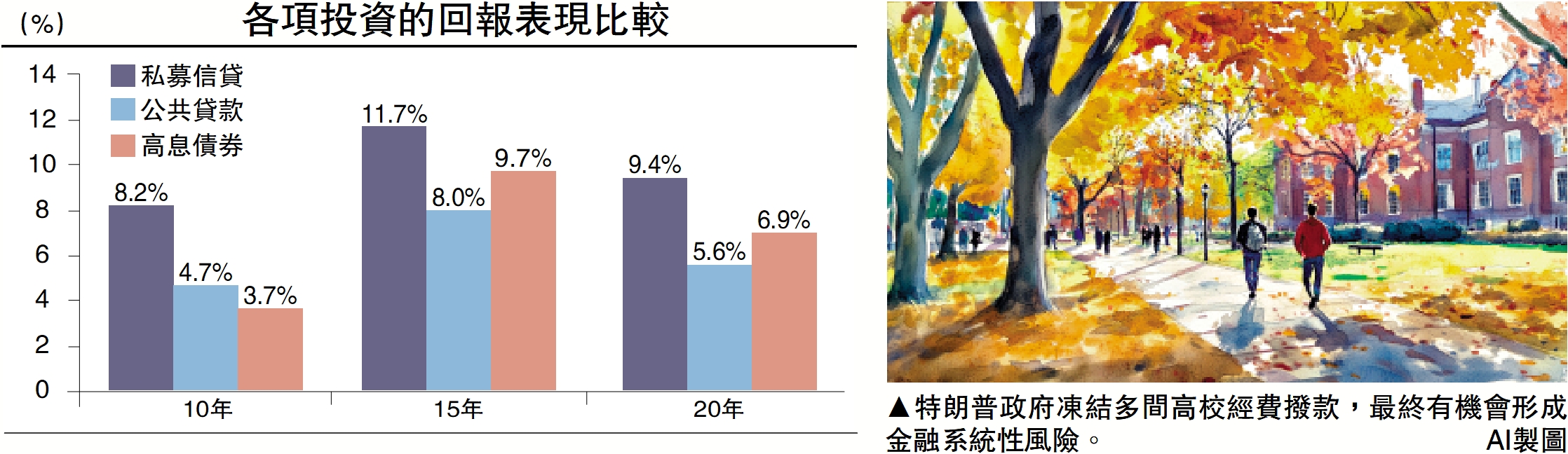 高校的捐贈基金本質上是私募信貸,指的是非銀行機構提供的定製化信貸。相比銀行貸款,私募信貸的審批更靈活,能夠包容和支持更小眾的資產類別,如大學經營。與公開市場債券比,私募債券的回報也更高。