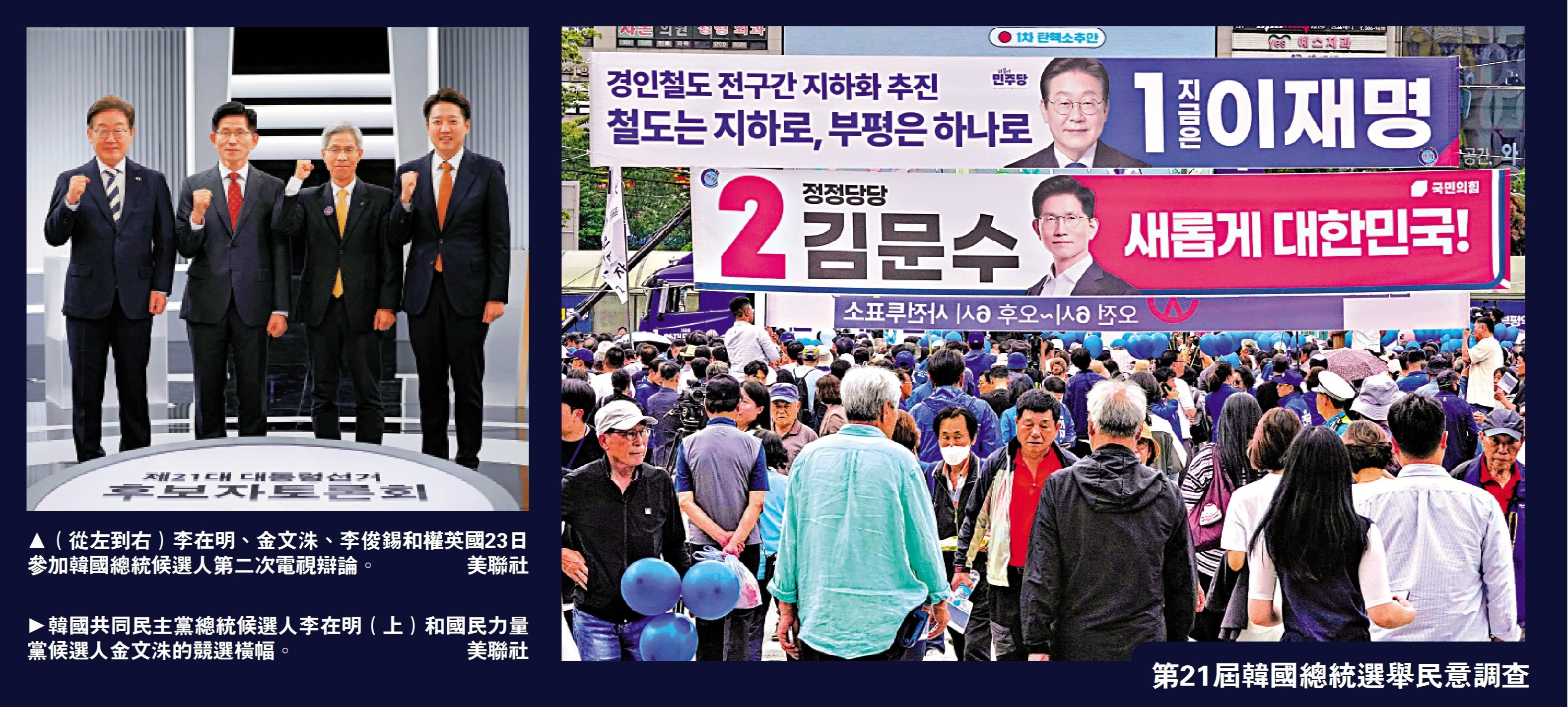 大公報綜合報道,韓國第21屆總統選舉將於6月3日正式舉行,民調機構蓋洛普韓國23日發布最新調查結果顯示,一度以明顯優勢領跑的最大在野黨共同民主黨候選人李在明,支持率突然下滑至45%。