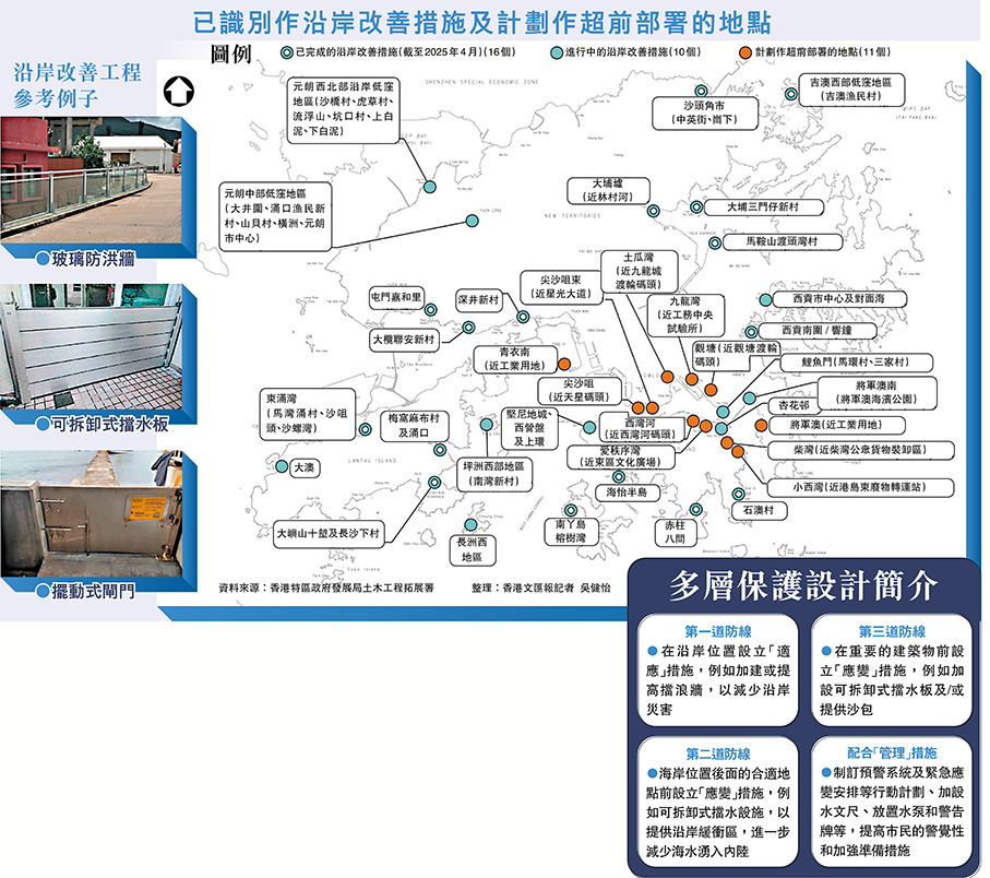 土拓署已檢視全港逾1,000公里海岸線並識別出26個高風險地點,海怡半島及赤柱等16個地區已完成沿岸改善防洪措施,其餘工程預料在2027年或之前完成,包括大澳、元朗西等。該署亦在九龍灣海堤等11個地點作「超前部署」,但未有制定相關工程時間表。