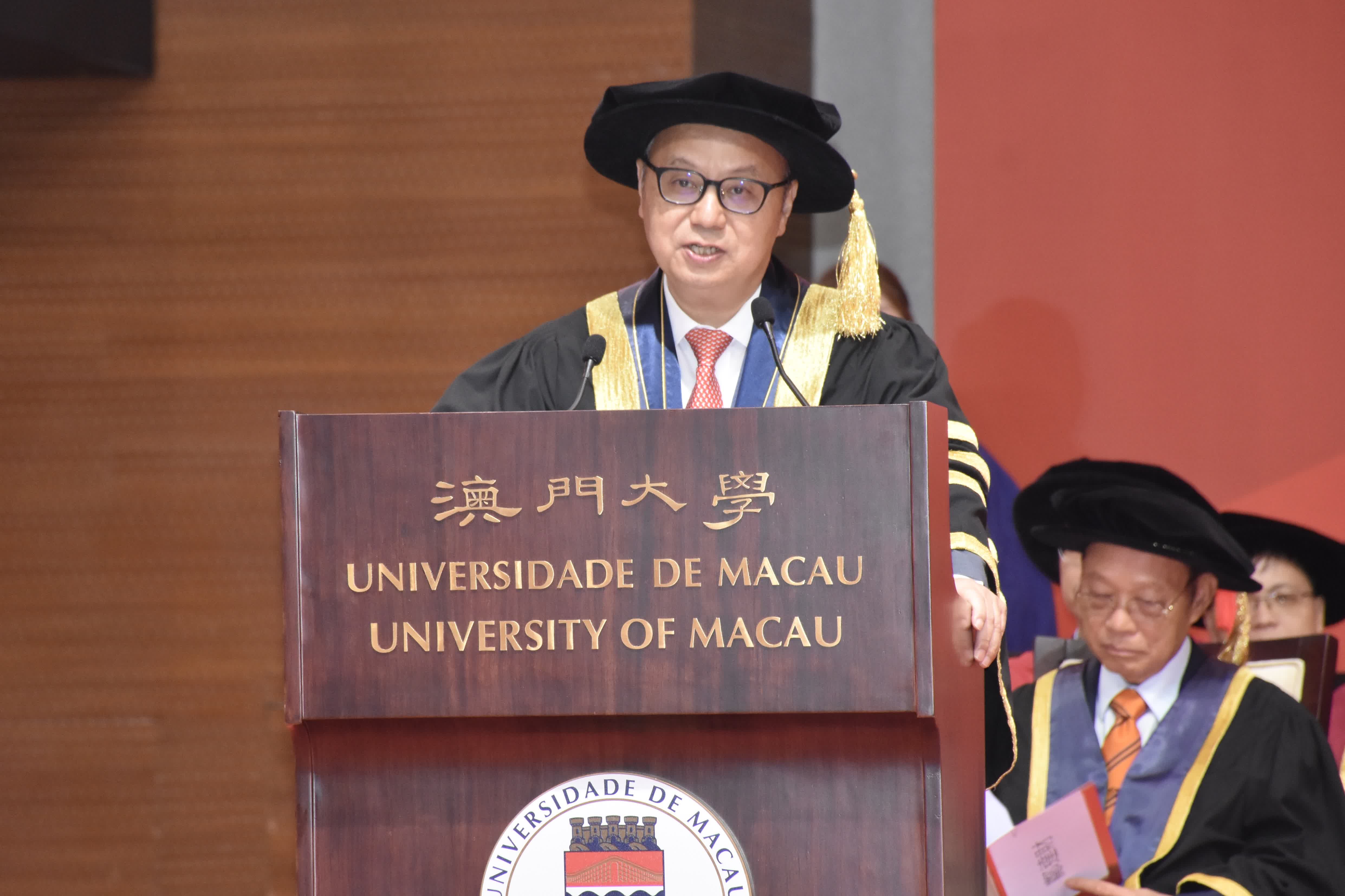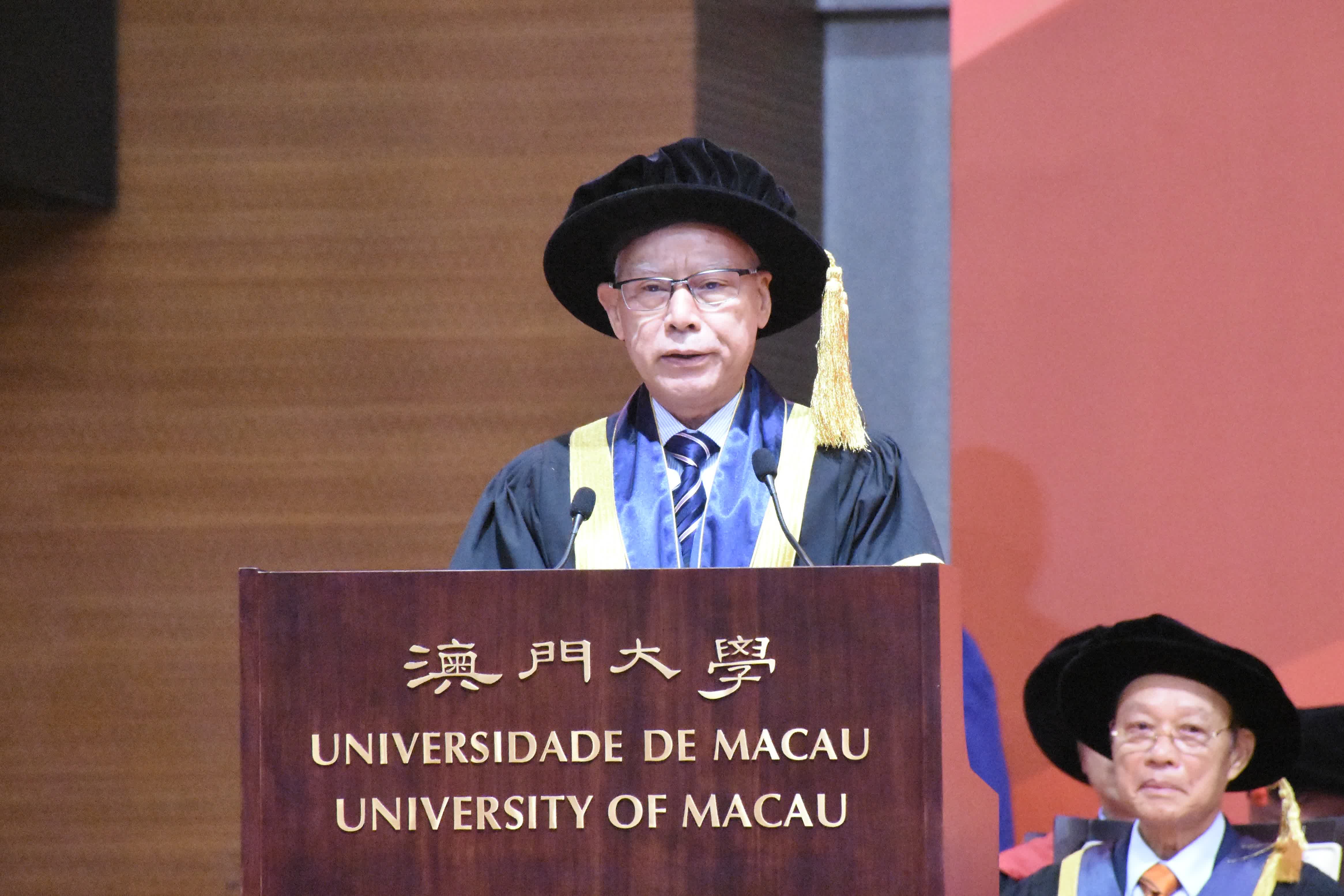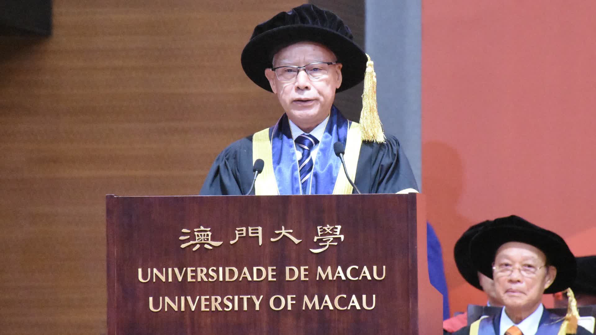 澳大校長宋永華寄語畢業生以赤子情懷、真才實學和創新智慧建設澳門,以及把握機遇和直面挑戰,並以青年力量奮進未來,亦可以結合人工智能或新媒體技術不斷在感興趣的領域開拓創新。