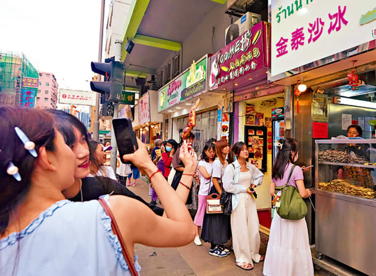 昨日下午,大公報記者在九龍城一帶,看到有不少旅客光顧小食店和食肆,例如以豆花聞名的小店、泰式快餐店等均見滿座。至於售賣串燒以及雞蛋仔等港式小食店,亦有遊客慕名前來品嘗。