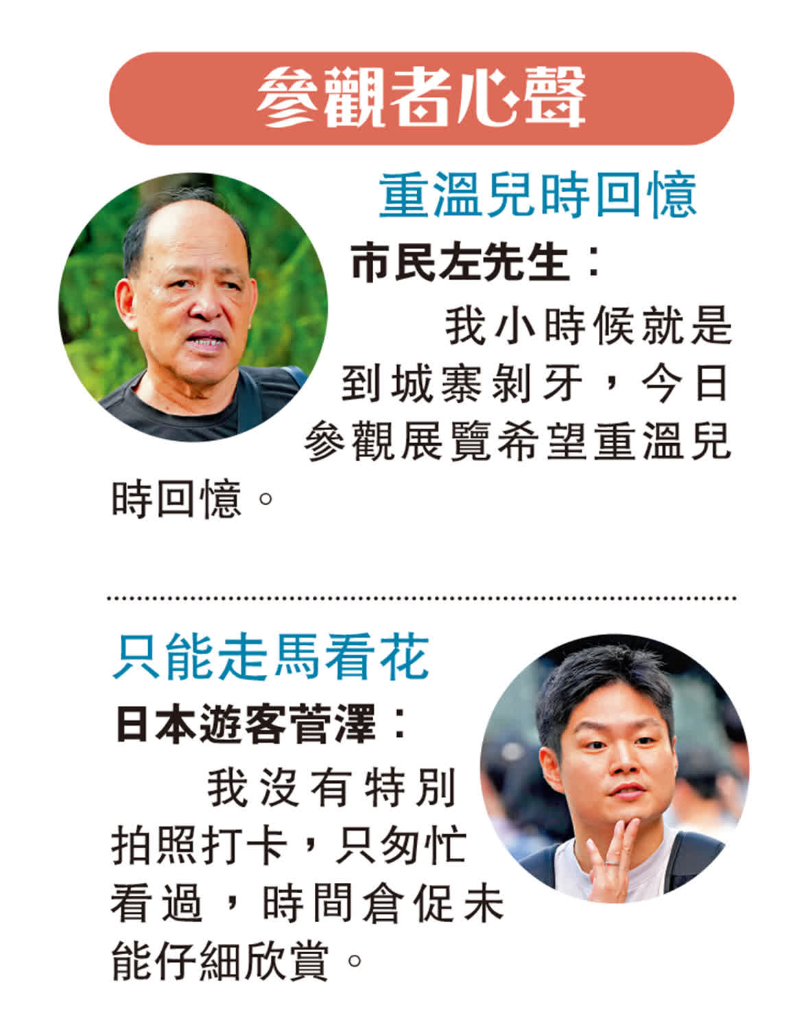 是次展覽透過沉浸式場景設計,融入本土傳統工藝元素,重現城寨日常。記者昨日現場目測,下午時分排隊人龍近百人,龍尾一度蔓延至接近「衙門」九龍城寨模型的位置。對於15分鐘參觀時間,觀眾普遍認為時間不足。日本遊客菅澤說,他獨自到來,沒有特別拍照「打卡」,感到時間「恰好」,但只算是匆忙看過,未能仔細欣賞,估計家庭客可能會感到時間倉促。