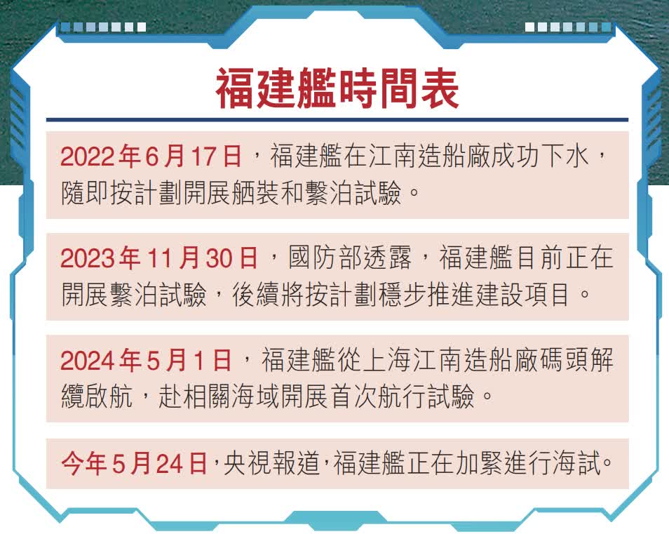 福建艦於2022年6月下水,目前已經過舾裝、繫泊試驗階段,近期正加緊海試。