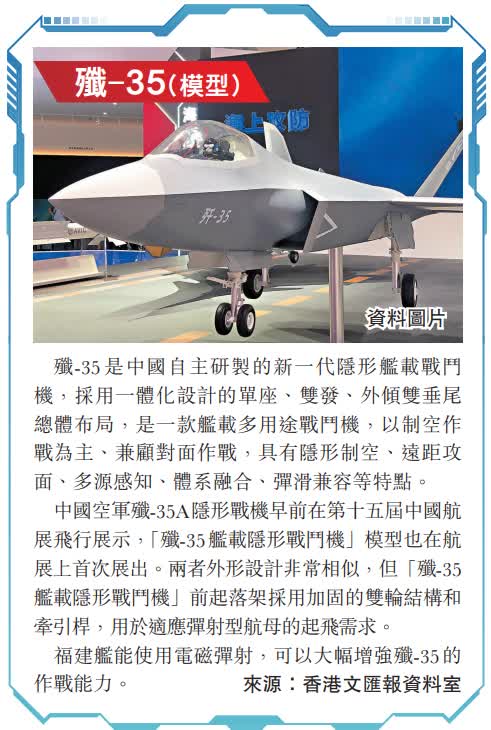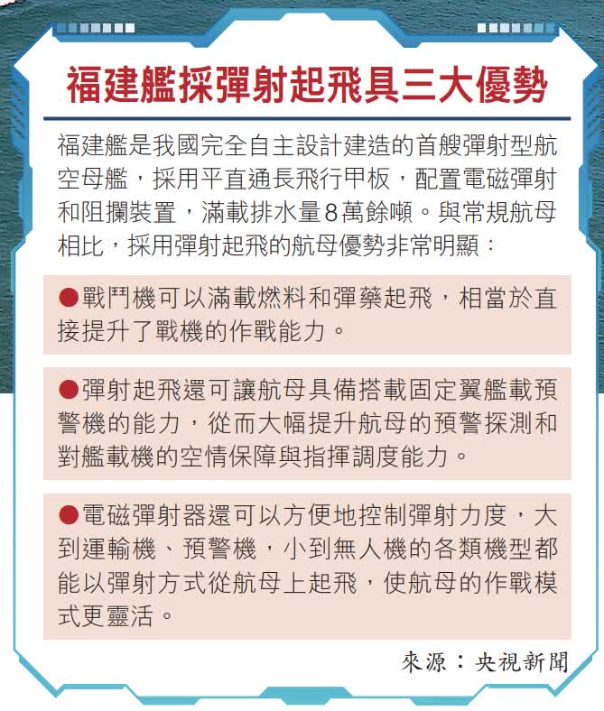 (香港文匯報記者 馬靜 北京報道)據央視新聞報道,作為我國首艘彈射型航空母艦,福建艦正在加緊進行海試。知名海軍專家張軍社接受香港文匯報專訪時表示,待福建艦服役,中國將正式進入三航母時代,福建艦使用電磁彈射系統,具有可搭載戰鬥機類型多,艦載戰鬥機可實現「滿油滿彈」起飛,戰鬥機出動能力更強等優勢,可大大提高航母及航母編隊作戰能力,推動中國海軍向近海防禦、遠海防衛轉型。