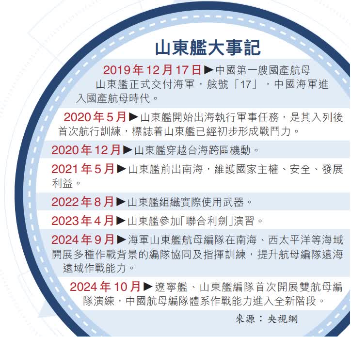 山東艦是我國第一艘完全自主設計、自主建造、自主配套的航空母艦,是我國重要的戰略威懾力量。2019年12月,山東艦正式入列,中國海軍進入國產航母時代。出遠海、闖大洋,山東艦從渤海試驗到南海訓練,從近海練兵到遠海部署,圓滿完成首次實兵對抗、首次跨區機動等10餘項重大演訓任務。如今,隨着山東艦航母編隊的戰鬥力不斷躍升,航跡也在不斷延伸刷新。