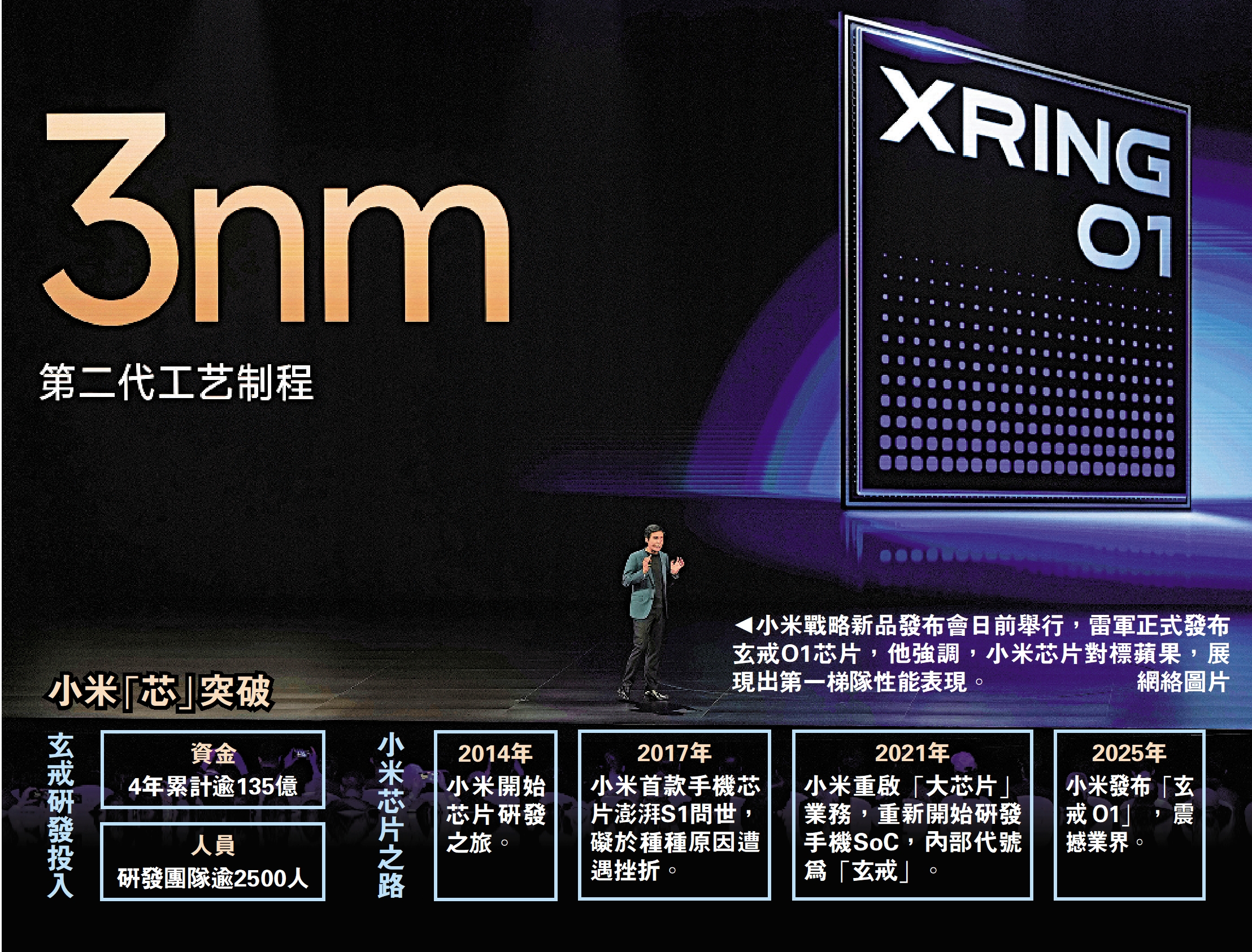 大公報綜合中國基金報、鳳凰網報道,小米玄戒O1系列芯片的推出,實現三大突破。首先,小米成為繼蘋果、高通、聯發科之後,全球第四家發布自主研發設計3納米製程手機處理器芯片的企業。第二,中國大陸地區首次成功實現3納米芯片設計的突破,緊追高通、蘋果,填補了大陸地區在先進製程芯片研發設計領域的空白。第三,小米將和華為一起,成為中國芯片的「雙璧」。從芯片設計到製造,在邁進自主可控和追趕國際領先的路上,攜手並進。