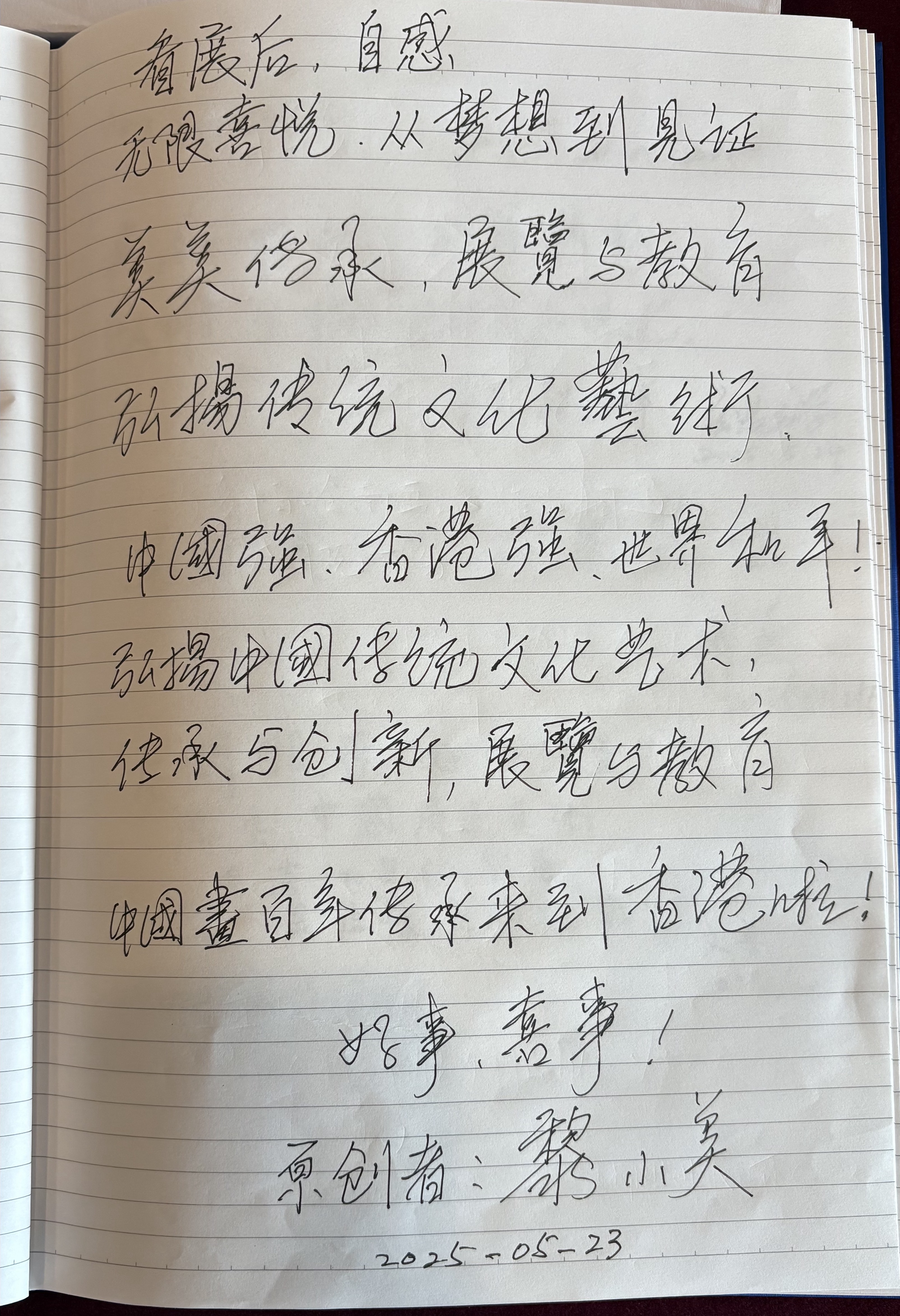 「看展後,自感無限喜悅,從夢想到見證美美傳承,展覽與教育,弘揚傳統文化藝術。中國強、香港強、世界和平!」