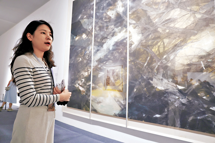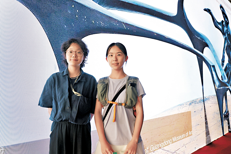 義務導賞員陳炫宇和萬琪表示,導賞員共有約20位,每天有約10位導賞員和兩位義工提供服務。她們都是從事藝術有關的行業,這次志願成為導賞員,在布展時就有老師帶領熟悉路線,提供線上指導和有關的作品資料等,目前帶領過香港中文大學、中央美術學院等團體。萬琪分享道,團員們反饋都很正面,藝術生會從中學到新的技法創新,非藝術生則表達了對民族文化的自豪感和認同感。