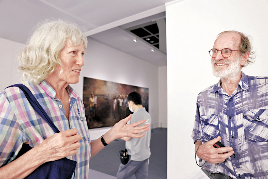 來自瑞士的遊客Bernhard與太太Erika來香港旅遊,遊覽會展中心時順道進來觀展。Erika評價展覽「impressed(印象深刻的)」和「interesting(有趣的)」,尤其喜歡一幅以「畫中畫」形式呈現的畫作《賞音》,認為這幅作品將觀賞者也納入畫面,十分有創意。