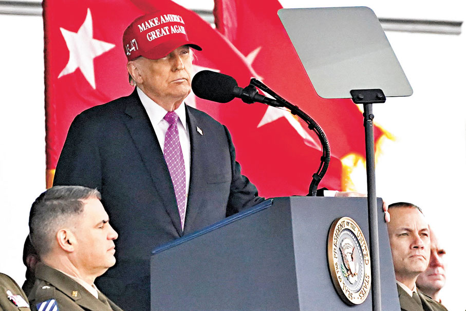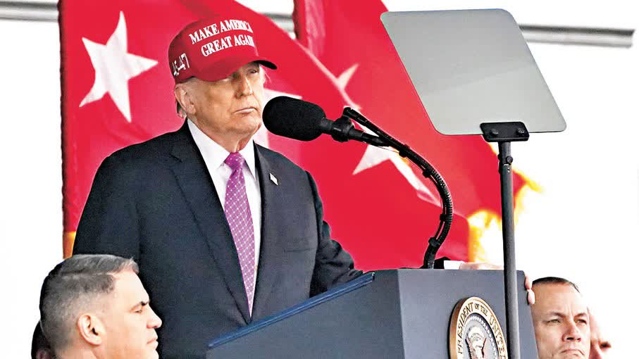 特朗普對現場約1,000名畢業生說,「美國武裝部隊的職責不是改造外國文化,而是隨時隨地壓制任何敵人,消滅任何對美國的威脅。」他指責前幾屆美國政府讓軍隊受制於形形色色的社會計劃和政治主張,卻放任邊境毫無防禦,耗盡國家的武器庫去打其他國家的戰爭,不過「這一切都結束了」,聲稱這是因自己從首個任期起就「重建」了美國軍隊。特朗普還藉機宣傳其價值1,750億美元(約1.37萬億港元)、號稱可攔截任何導彈的「金穹」反導系統計劃,以及所謂的「1萬億美元(約7.8萬億港元)軍事預算」。