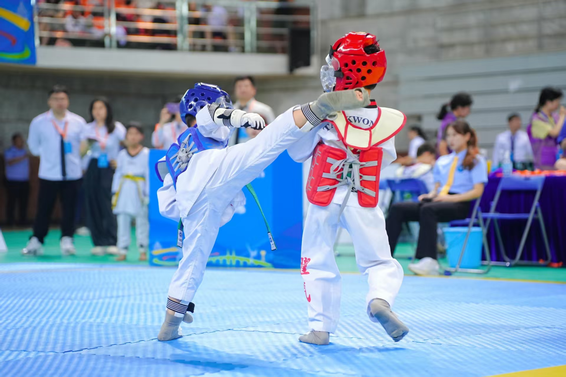 賽場上,運動員們身穿白色跆拳道服,頭戴護具面罩,時而氣定神閑、騰挪跳躍,時而動如脫兔、箭似離弦,上演一場場精彩對決。重拳、飛腿、迴旋踢……選手們使出渾身解數,你來我往,互不相讓,爭奪冠軍寶座。