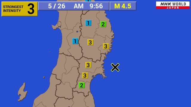 據中新網援引日本廣播協會(NHK)報道,日本氣象廳消息,當地時間26日上午9時56分左右,日本宮城縣附近海域發生4.5級地震,震源深度30公里,最大震感為震度3。
