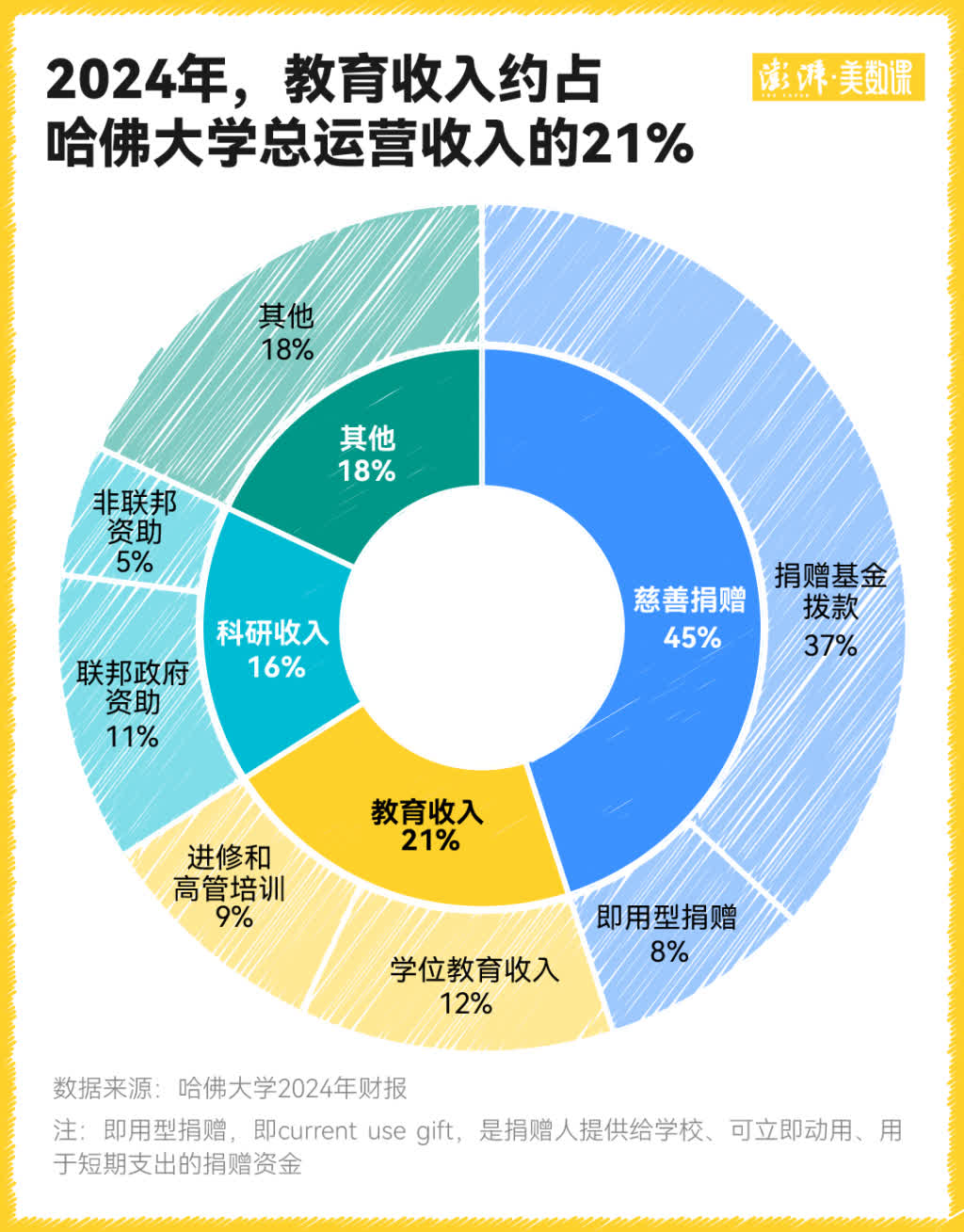 2024年,哈佛大學的教育收入約為14億美元,包括學費、住宿費、伙食費等,共佔哈佛大學總運營收入的21%。