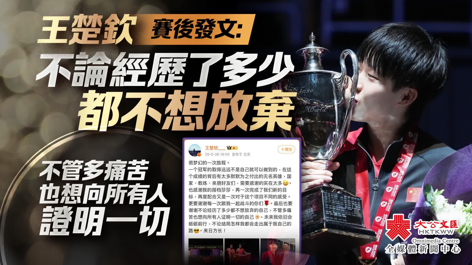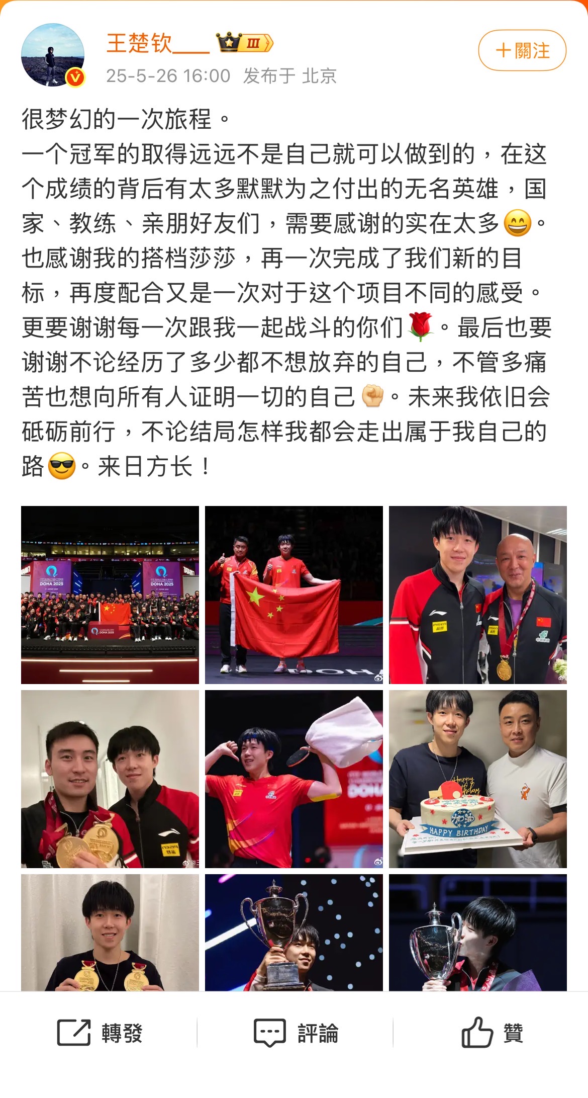 王楚欽今日(26日)在社交平台發文,感謝國家、教練、親朋好友,以及自己的搭檔孫穎莎:「很夢幻的一次旅程。一個冠軍的取得遠遠不是自己就可以做到的,在這個成績的背後有太多默默為之付出的無名英雄,國家、教練、親朋好友們,需要感謝的實在太多。也感謝我的搭檔莎莎,再一次完成了我們新的目標,再度配合又是一次對於這個項目不同的感受。更要謝謝每一次跟我一起戰鬥的你們。最後也要謝謝不論經歷了多少都不想放棄的自己,不管多痛苦也想向所有人證明一切的自己。未來我依舊會砥礪前行,不論結局怎樣我都會走出屬於我自己的路。來日方長!」