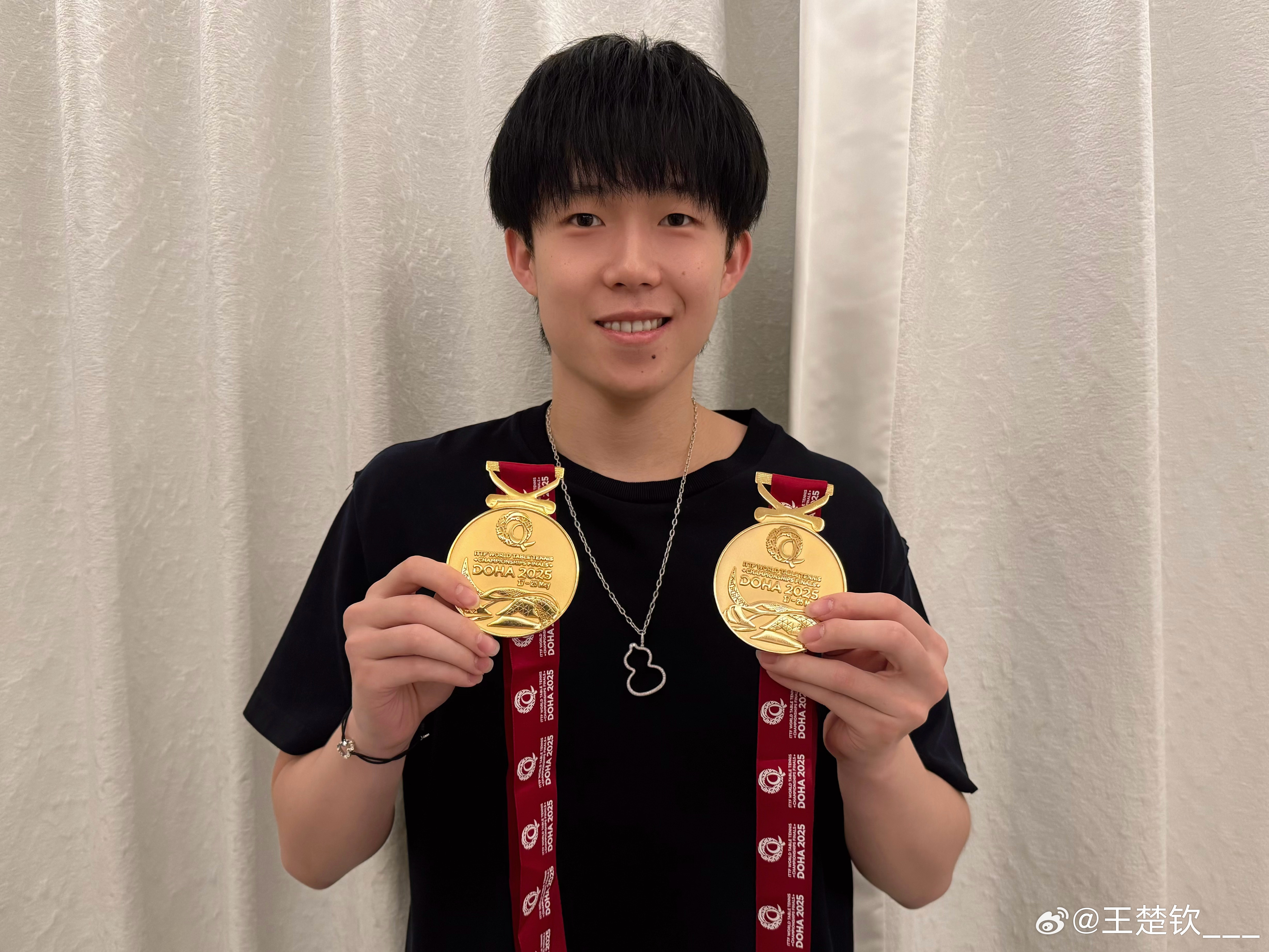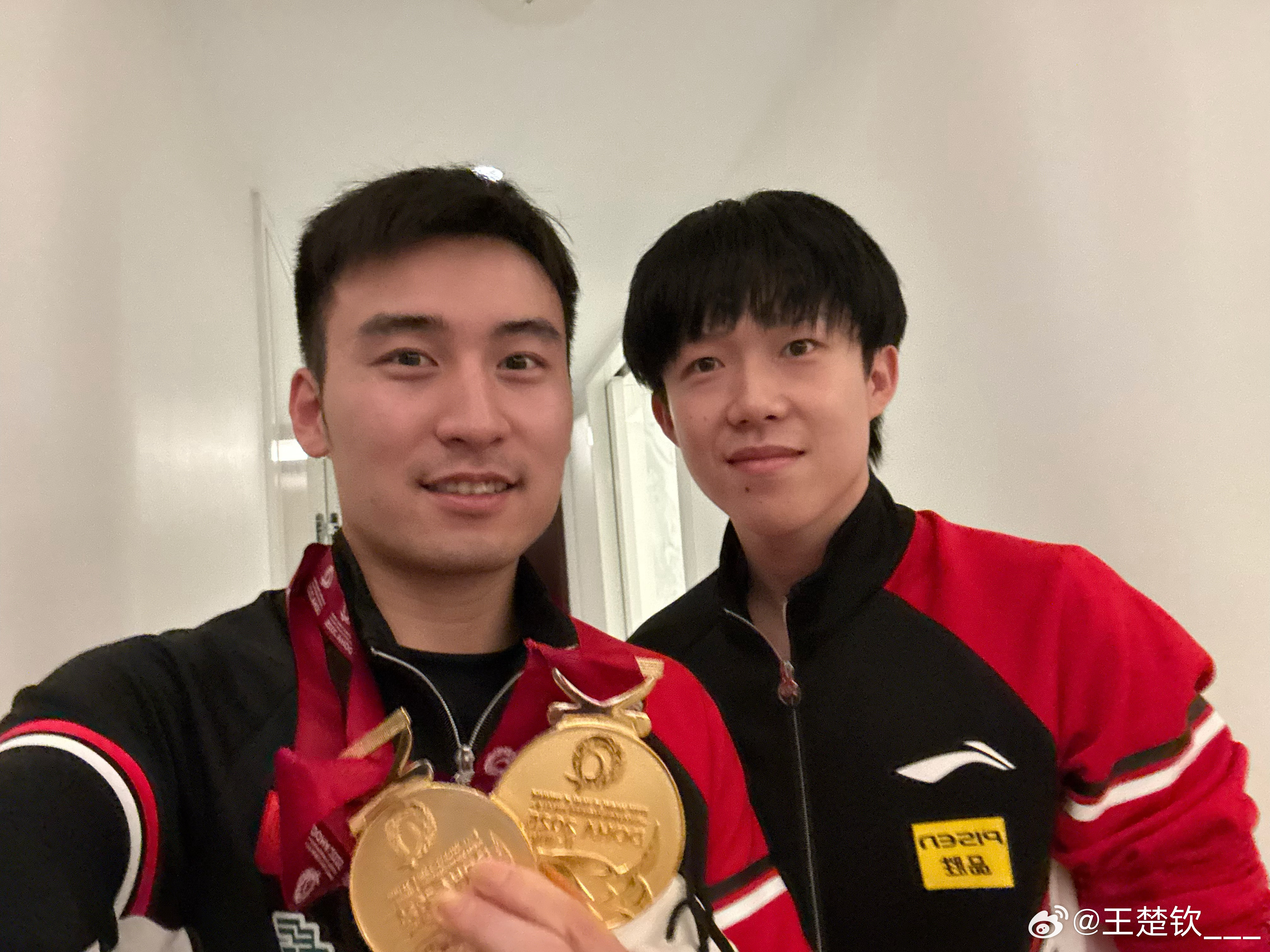 王楚欽還在帖文中發布了多張照片,包括自己親吻獎盃、手持兩枚金牌的照片等。