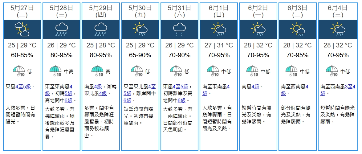 天文台預測明日(27日)天氣將是暴風雨前最佳,氣溫介乎25至29度,吹東風4至5級,大致多雲,日間短暫時間有陽光。