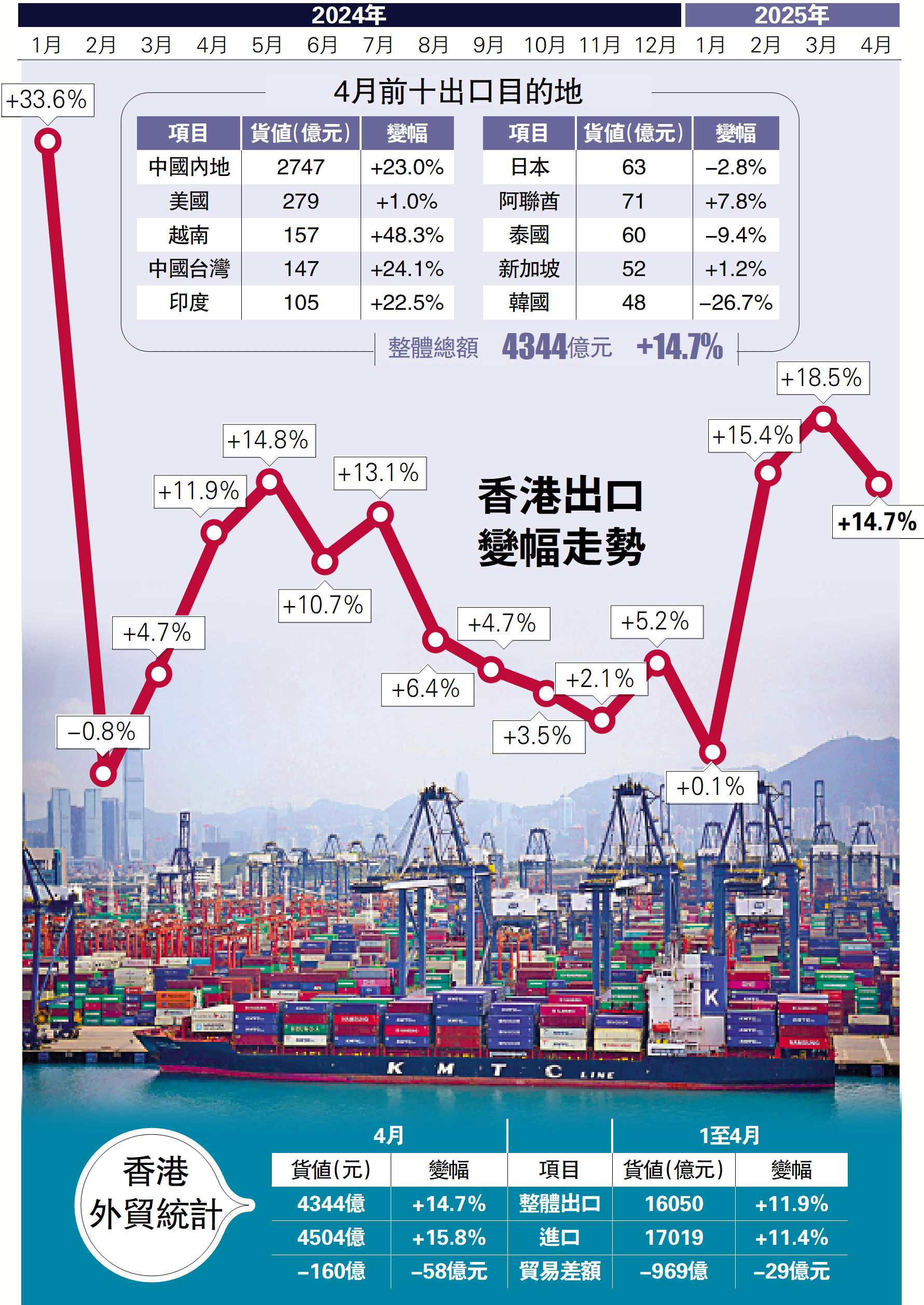 美國總統特朗普4月初宣布所謂「對等關稅」,該項關稅計劃暫時對香港出口貿易未見到負面影響,反而因着廠商趕在關稅實施前,加緊付運物品而拉動香港整體進出口貿易表現。繼3月份商品整體出口貨值錄得18.5%按年升幅,統計處最新公布數據顯示,香港4月份商品整體出口貨值按年上升14.7%至4344億元,連續第二個月超過4000億元。另外,4月份商品進口貨值為4504億元,按年上升15.8%。4月份有形貿易逆差160億元。
