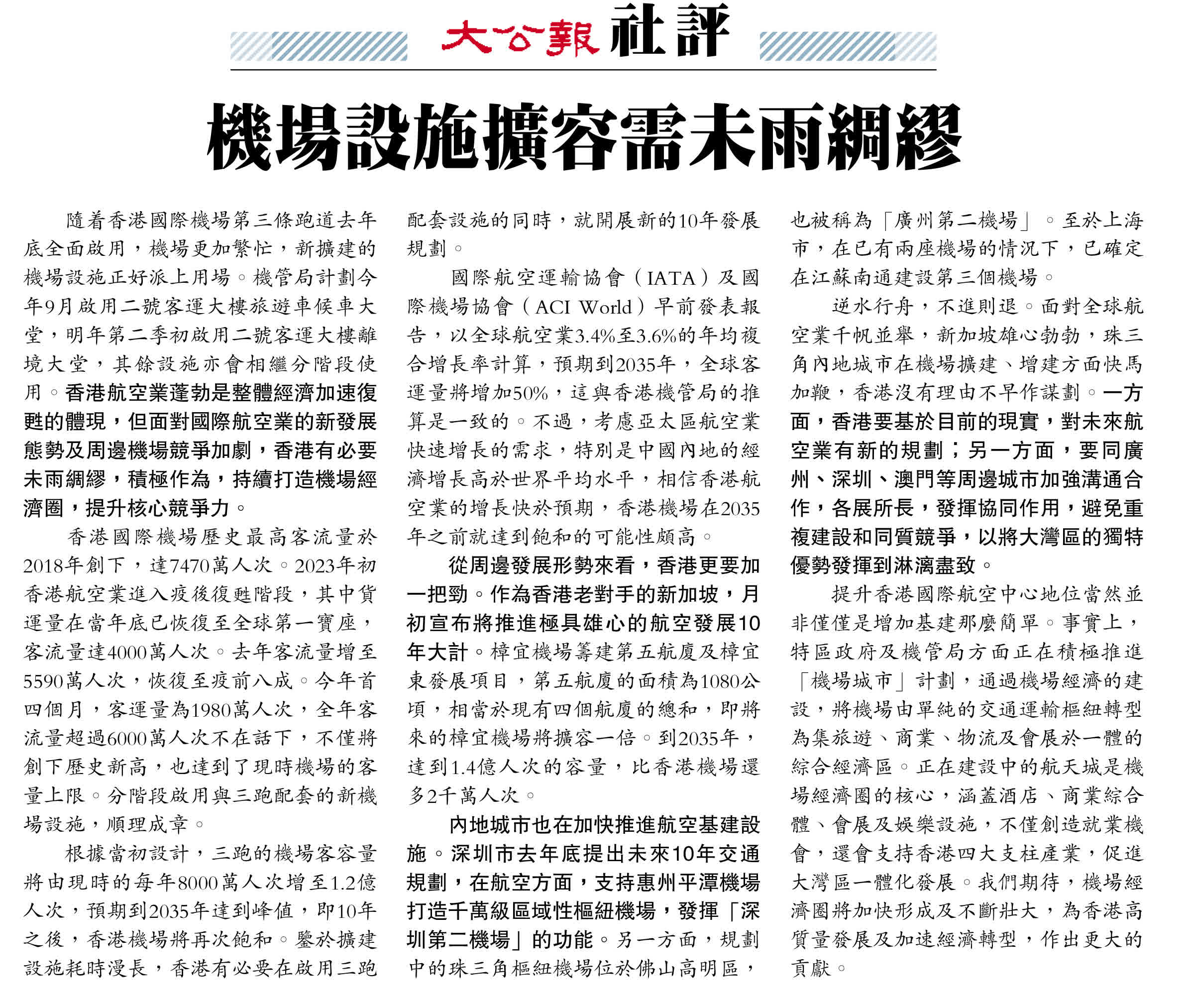 提升香港國際航空中心地位當然並非僅僅是增加基建那麼簡單。事實上,特區政府及機管局方面正在積極推進「機場城市」計劃,通過機場經濟的建設,將機場由單純的交通運輸樞紐轉型為集旅遊、商業、物流及會展於一體的綜合經濟區。正在建設中的航天城是機場經濟圈的核心,涵蓋酒店、商業綜合體、會展及娛樂設施,不僅創造就業機會,還會支持香港四大支柱產業,促進大灣區一體化發展。我們期待,機場經濟圈將加快形成及不斷壯大,為香港高質量發展及加速經濟轉型,作出更大的貢獻。