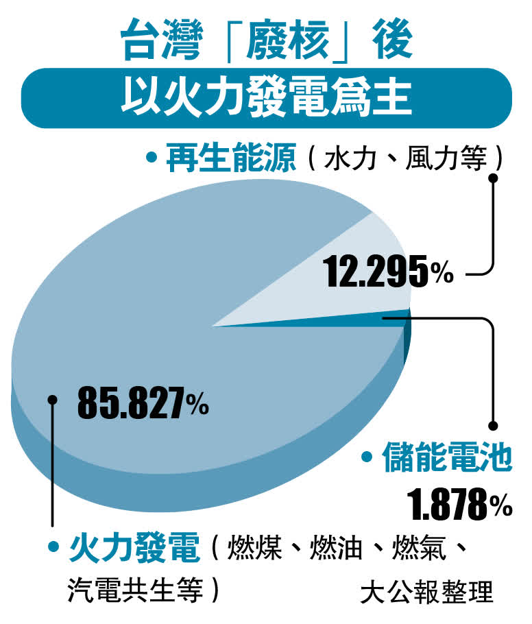 淘汰作為清潔能源的核電,改用傳統火電,島內輿論認為,「非核家園」換來的是電力價格、高碳排發電、供電穩定以及能源安全等多個難題相互纏繞的僵局。