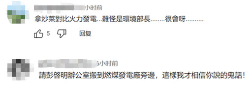 還有網友稱,「拿炒菜對比火力發電……難怪是『環境部長』……很會呀……」「請彭啟明辦公室搬到燃煤發電廠旁邊,這樣我才相信你說的鬼話」!