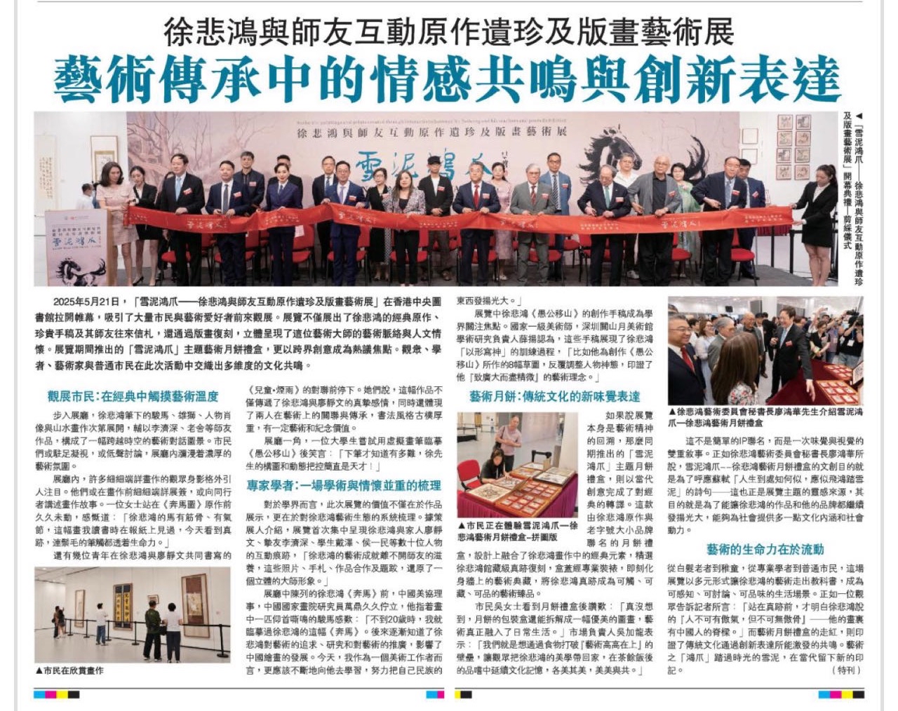 2025年5月21日,「雪泥鴻爪——徐悲鴻與師友互動原作遺珍及版畫藝術展」在香港中央圖書館拉開帷幕,吸引了大量市民與藝術愛好者前來觀展。展覽不僅展出了徐悲鴻的經典原作、珍貴手稿及其師友往來信札,還通過版畫復刻,立體呈現了這位藝術大師的藝術脈絡與人文情懷。展覽期間推出的「雪泥鴻爪」主題藝術月餅禮盒,更以跨界創意成為熱議焦點。觀眾、學者、藝術家與普通市民在此次活動中交織出多維度的文化共鳴。