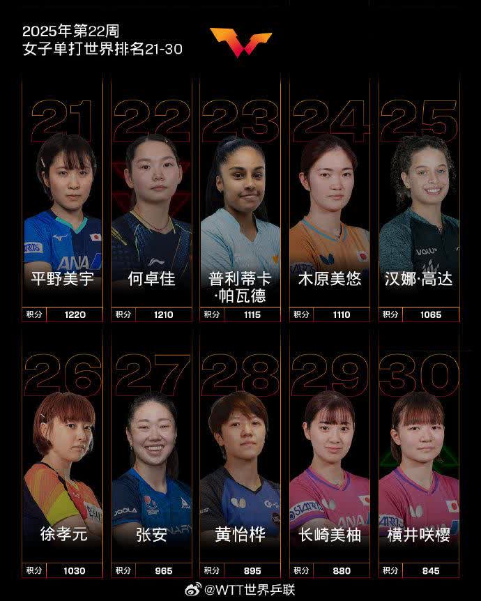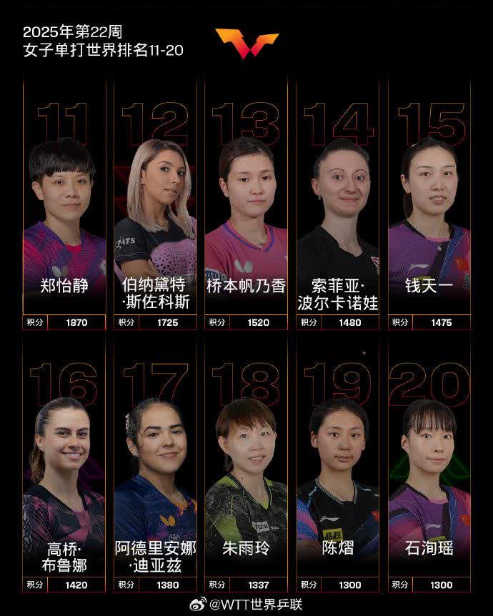 據央視新聞報道,世界乒聯公布2025年第22周排名。女單方面,憑藉多哈世乒賽冠軍的優異表現,孫穎莎進一步鞏固領先地位,以11900分繼續霸榜第一,並刷新自己保持的WTT歷史最高積分紀錄。王曼昱、陳幸同、王藝迪和蒯曼排名2-5位。
