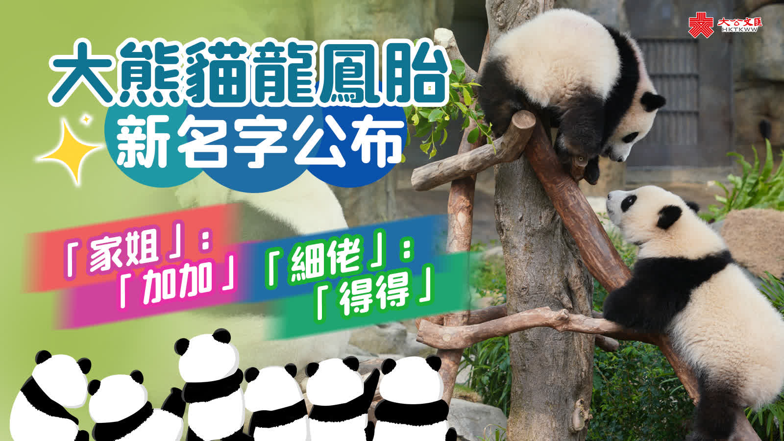 大公文匯全媒體報道,海洋公園今日(27日)公布一對港產大熊貓龍鳳胎寶寶的新名字!「家姐」新名字為「加加」;「細佬」新名字為「得得」。