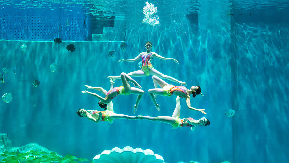 記者在海洋館極美極夢幻的水下世界看到,五位國內外頂級水舞表演藝術家化身「冰海芭蕾舞者」,在冰海深處展開巨型蝴蝶羽翼,與美人魚共舞「海底圓舞曲」,演繹浪漫唯美的「水中倒影」,「極光之翼」,「心心相印」等首創新動作,將水下芭蕾、花樣游泳與形體藝術完美融合,呈現力與美交織的視覺盛宴。