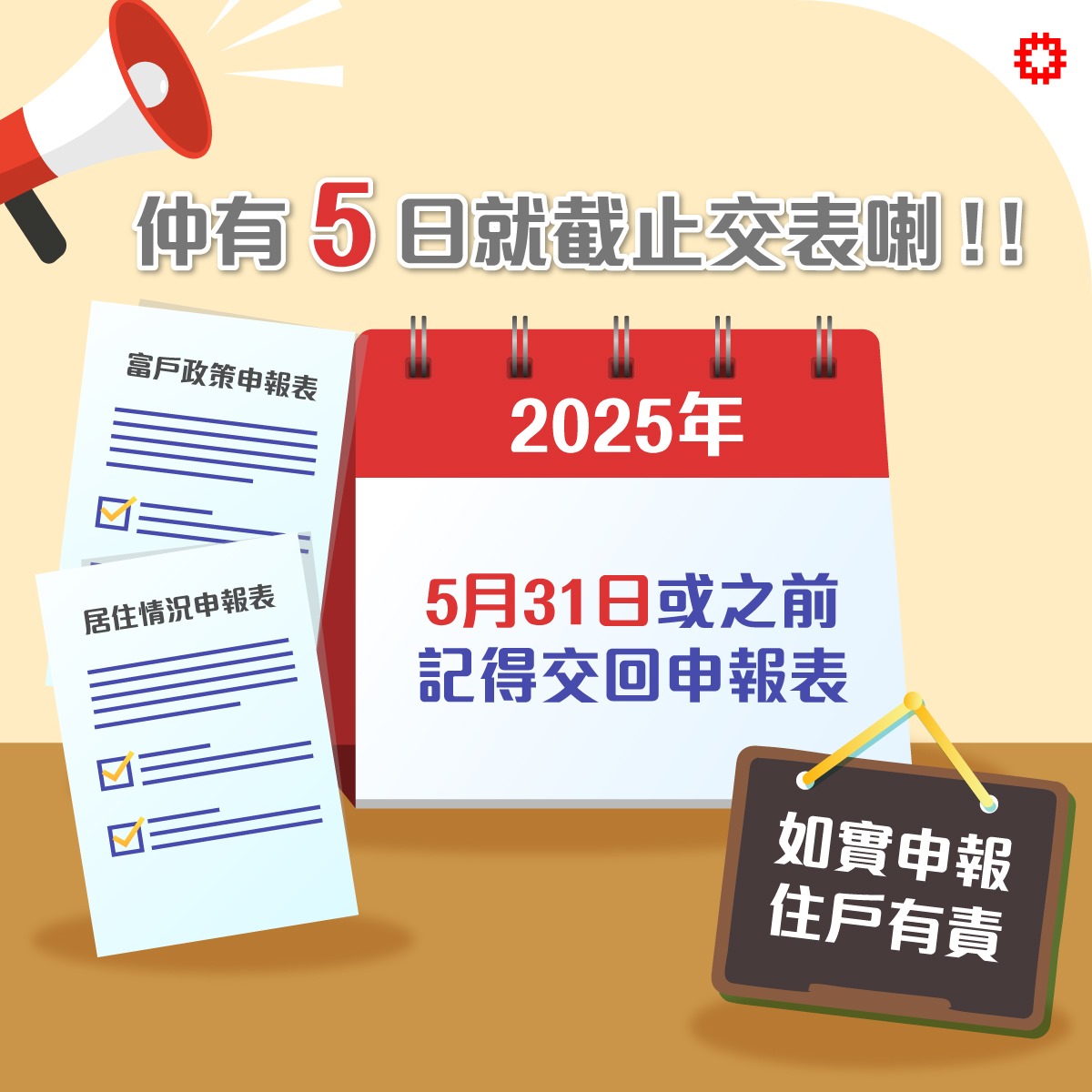 大公文匯全媒體報道,房委會今年4月1日已向約21萬新一輪「富戶政策」申報周期的公屋租戶派發「富戶政策」申報表及「居住情況申報表」。房屋局局長何永賢今日(27日)在社交網頁發文,提醒有關租戶記得如實申報,並於5月31日,即本周六或之前填妥申報表交回房屋署,以免被終止租約。