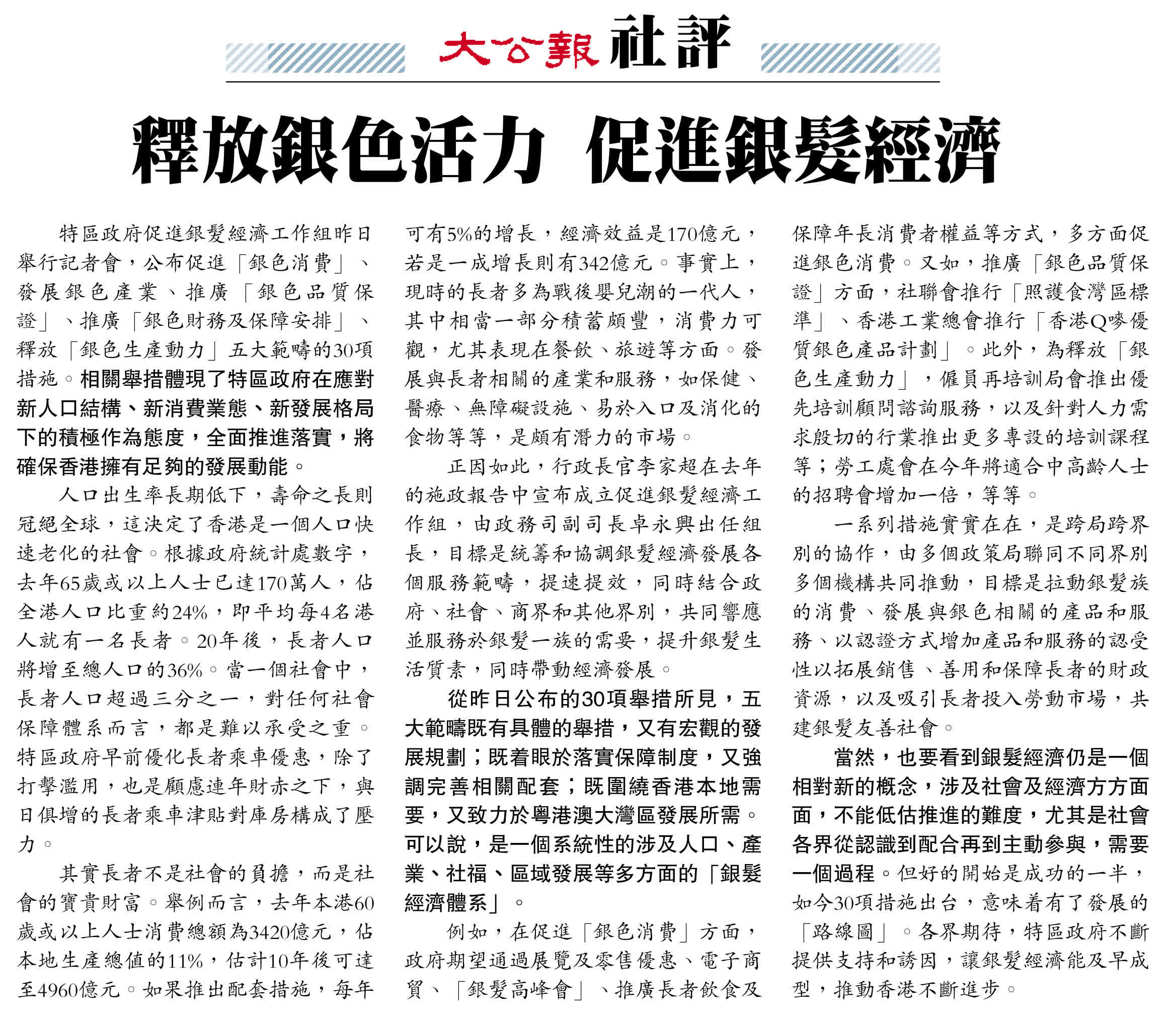 從昨日公布的30項舉措所見,五大範疇既有具體的舉措,又有宏觀的發展規劃;既着眼於落實保障制度,又強調完善相關配套;既圍繞香港本地需要,又致力於粵港澳大灣區發展所需。可以說,是一個系統性的涉及人口、產業、社福、區域發展等多方面的「銀髮經濟體系」。