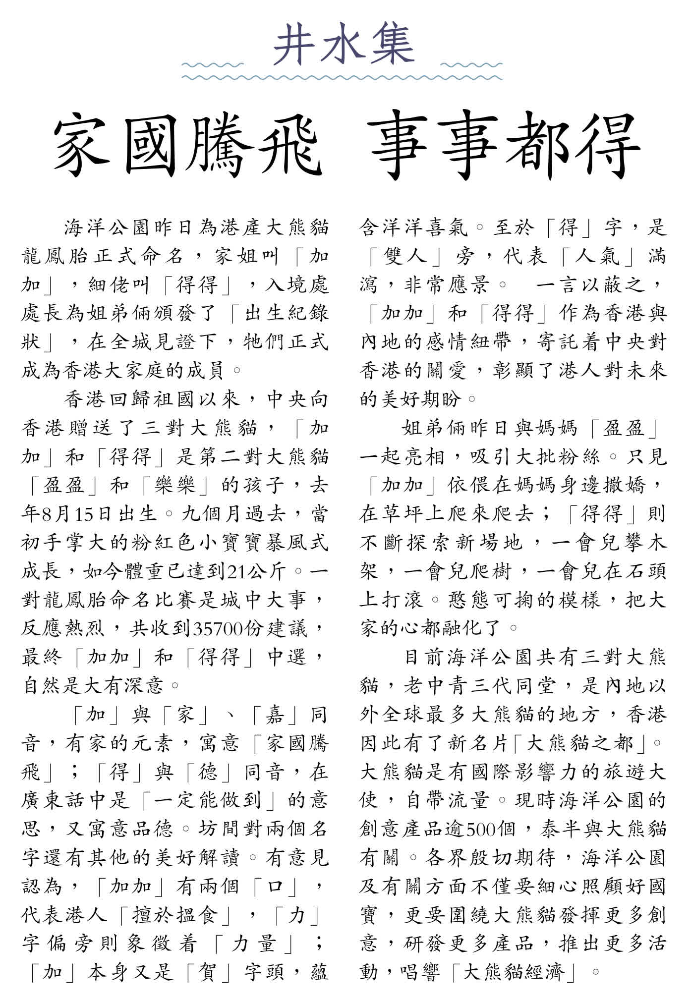 香港回歸祖國以來,中央向香港贈送了三對大熊貓,「加加」和「得得」是第二對大熊貓「盈盈」和「樂樂」的孩子,去年8月15日出生。九個月過去,當初手掌大的粉紅色小寶寶暴風式成長,如今體重已達到21公斤。一對龍鳳胎命名比賽是城中大事,反應熱烈,共收到35700份建議,最終「加加」和「得得」中選,自然是大有深意。