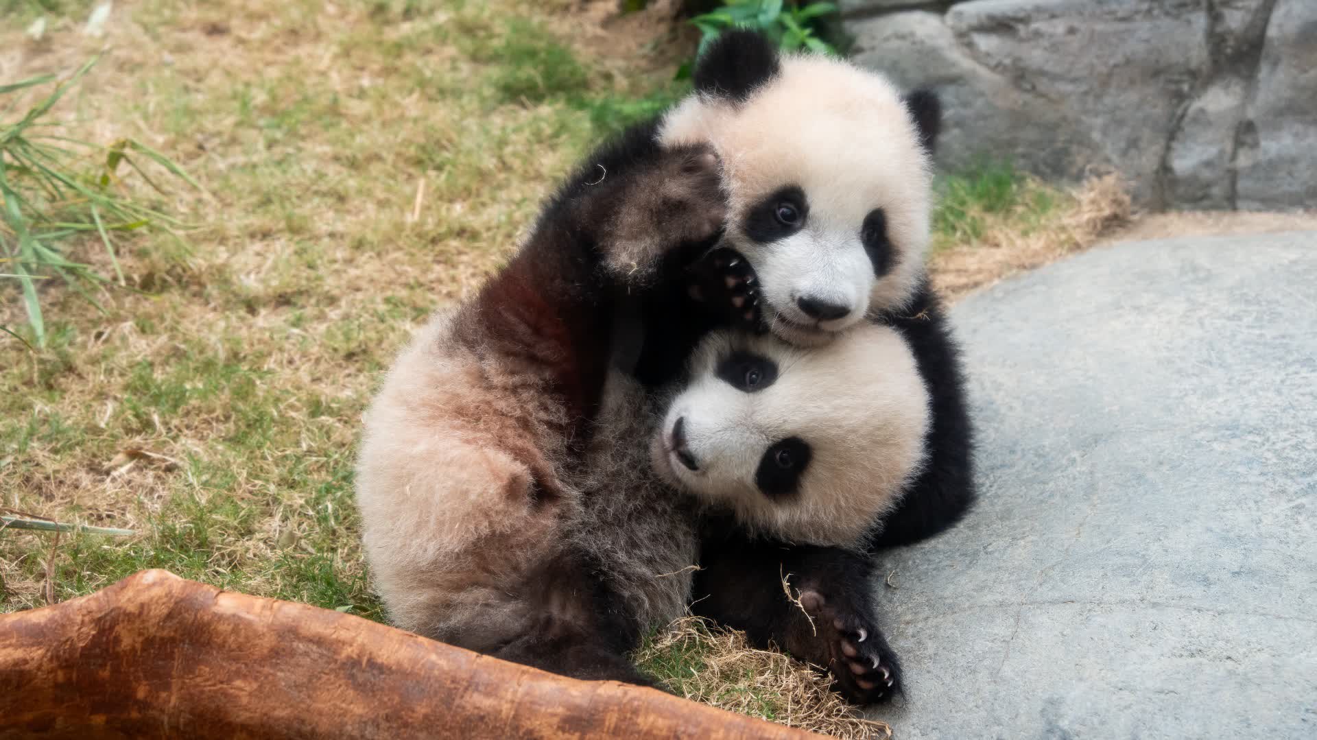 姐弟倆昨日與媽媽「盈盈」一起亮相,吸引大批粉絲。只見「加加」依偎在媽媽身邊撒嬌,在草坪上爬來爬去;「得得」則不斷探索新場地,一會兒攀木架,一會兒爬樹,一會兒在石頭上打滾。憨態可掬的模樣,把大家的心都融化了。