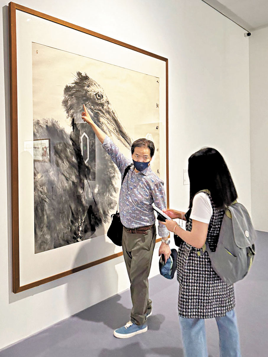 藍天畫室的創始人黃振賢和學生一同在展覽的第六版塊「百花爭妍」觀展時,對方土於2004年創作的作品《人類的朋友》評價頗高。他向學生講解道,這幅畫的用筆看似隨意,但筆鋒中全是「控制」;在畫面主體的邊緣,可以明顯看出嶺南畫派的「渲染」技法。他點明很多嶺南派畫家尤擅駕馭「墨的濃淡」,在這幅畫作左側打造出的「透」感,正是駕馭這一技法嫻熟又結合了當代技法創新的實證。