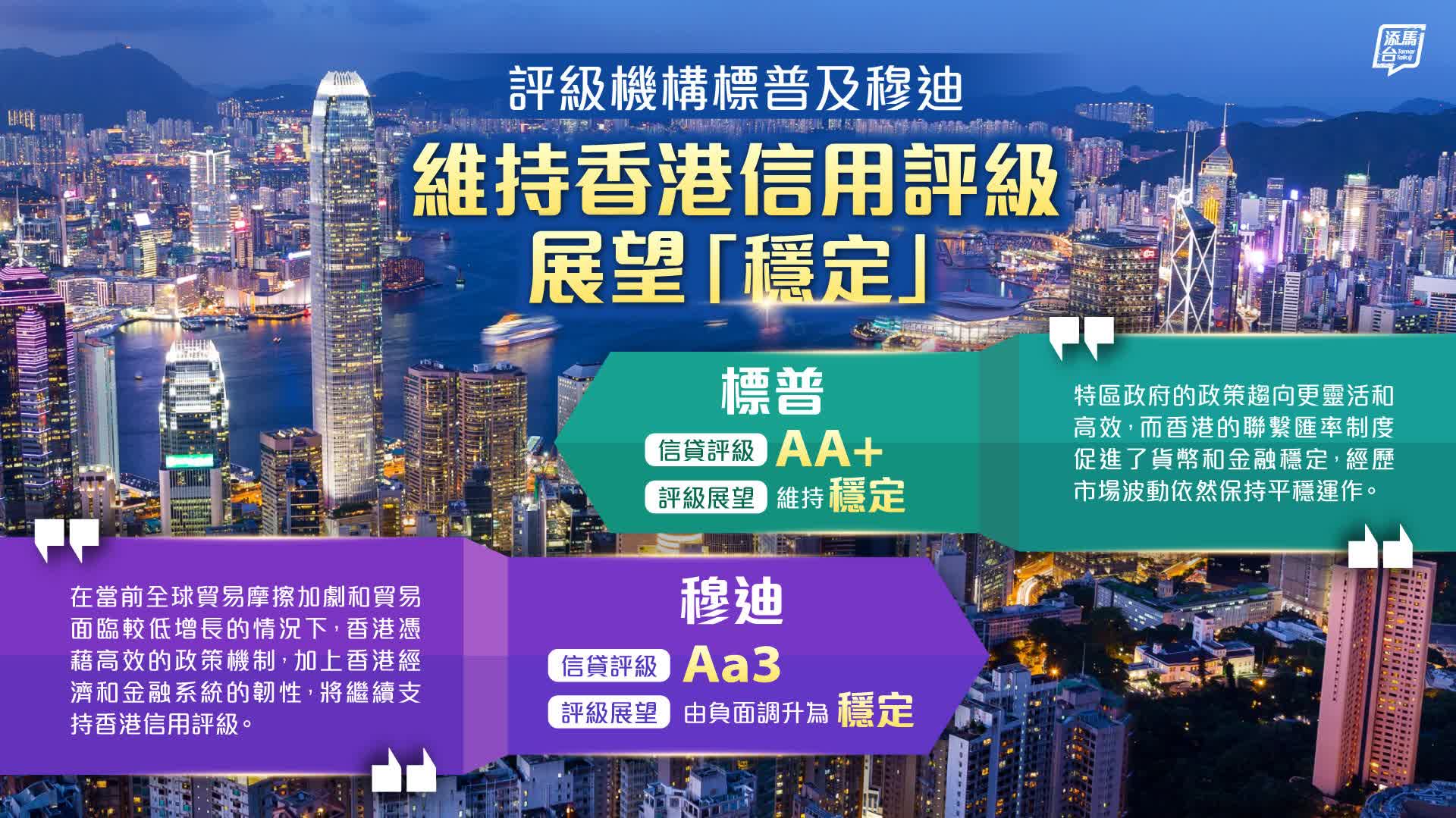 繼評級機構惠譽確認香港的信用評級,標普及穆迪於5月27日分別發表報告,維持香港的信用評級,並給予香港「穩定」的評級展望。這反映香港在全球經濟和金融不確定性增加之際,具備穩定前行的韌性。看圖了解更多。