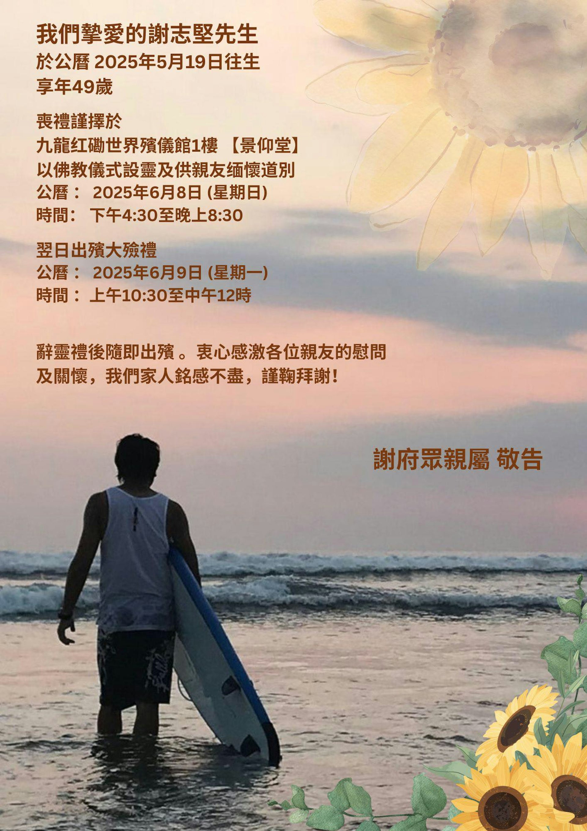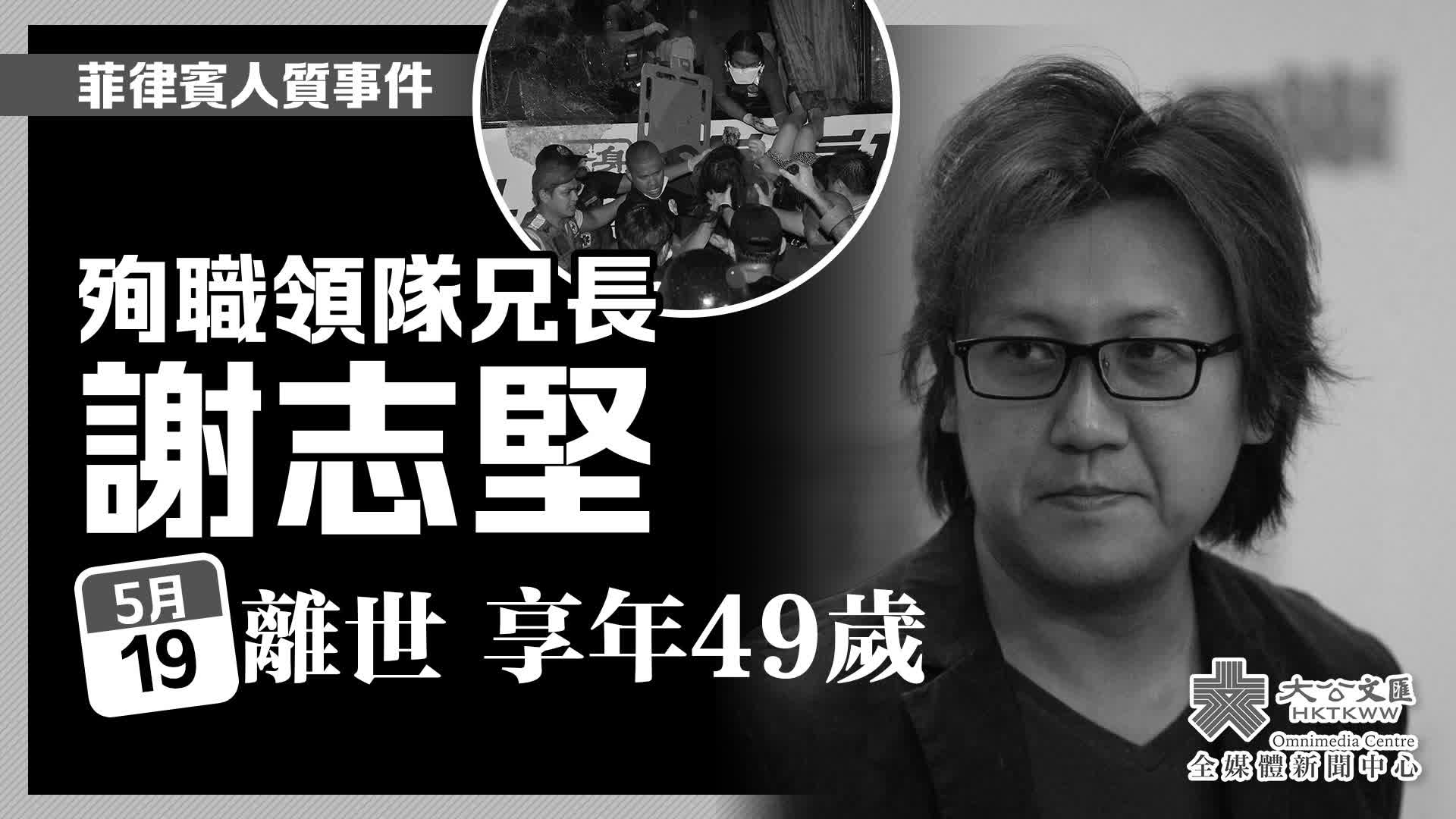 大公文匯全媒體報道,2010年震撼港人的菲律賓馬尼拉人質事件中,被挾持的港人旅行團有7名人質受傷,8名人質死亡,包括領隊謝廷駿。其兄長謝志堅多年來為事件奔走,謝志堅的親屬今日(28日)發訃告,指謝志堅於5月19日離世,享年49歲,6月8日會在紅磡世界殯儀館設靈,翌日出殯。