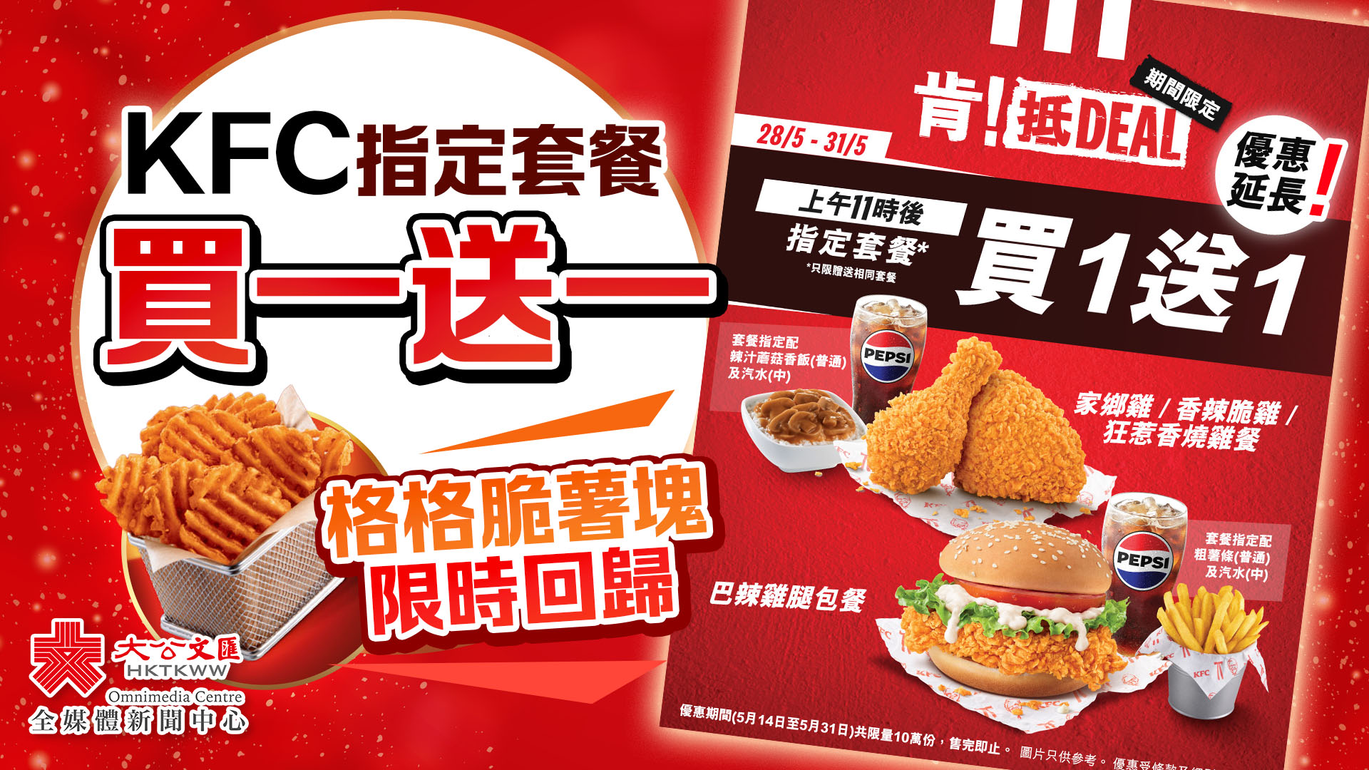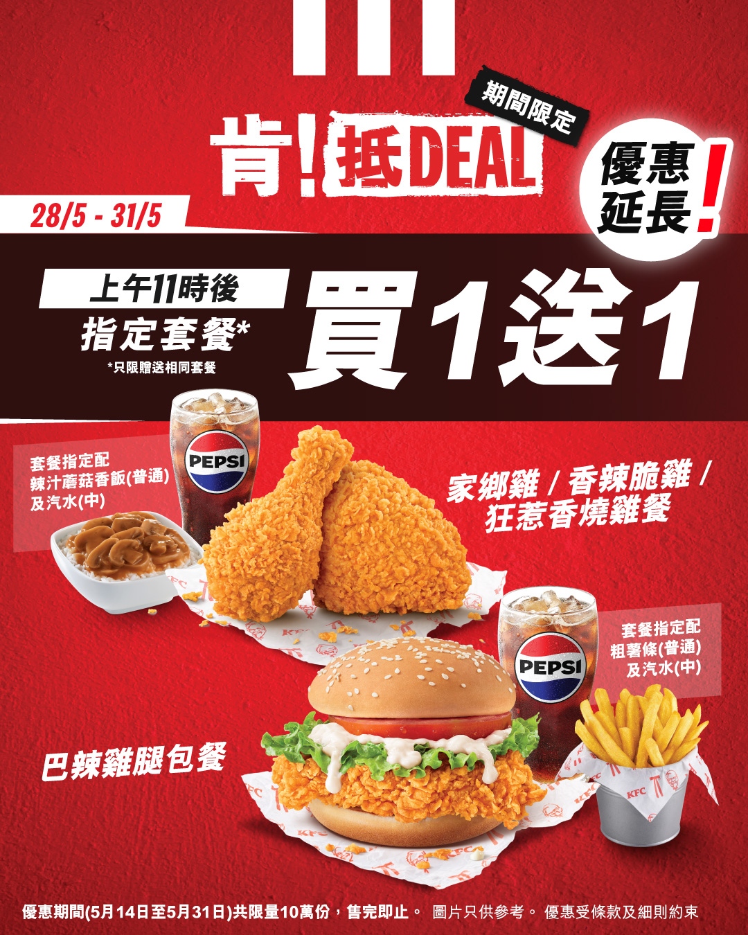 買一送一指定套餐包括,巴辣雞腿包餐——跟餐小食固定為粗薯條(普通),飲品固定為汽水(中);家鄉雞餐/香辣脆雞餐/狂惹香燒雞餐——跟餐小食固定為辣汁蘑菇香飯(普通),飲品固定為汽水(中)。優惠期只限於5月28日至31日上午11時後供應,且不可轉配或升級其他小食。優惠期間(5月14日至5月31日)限量供應10萬份,售完即止。