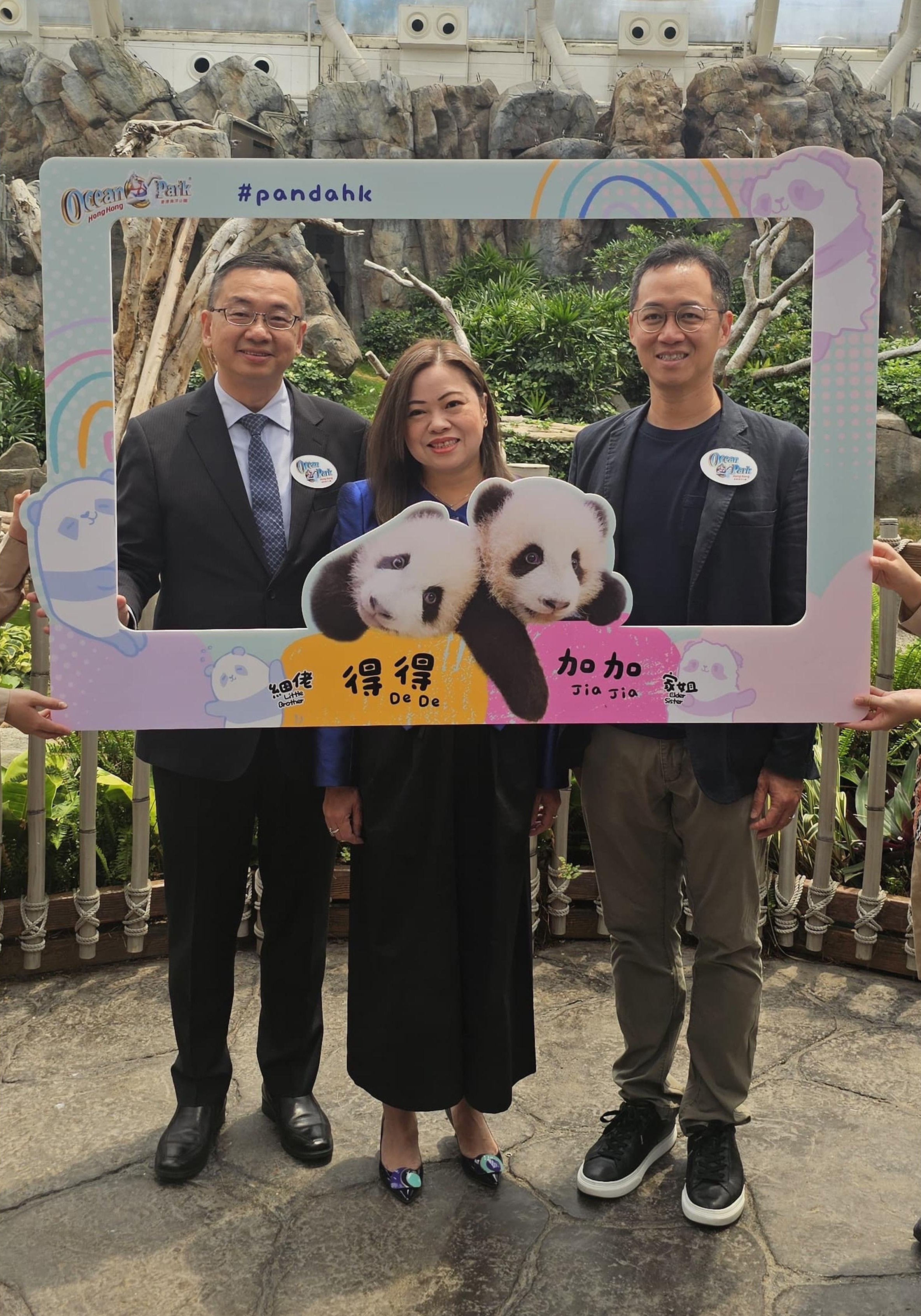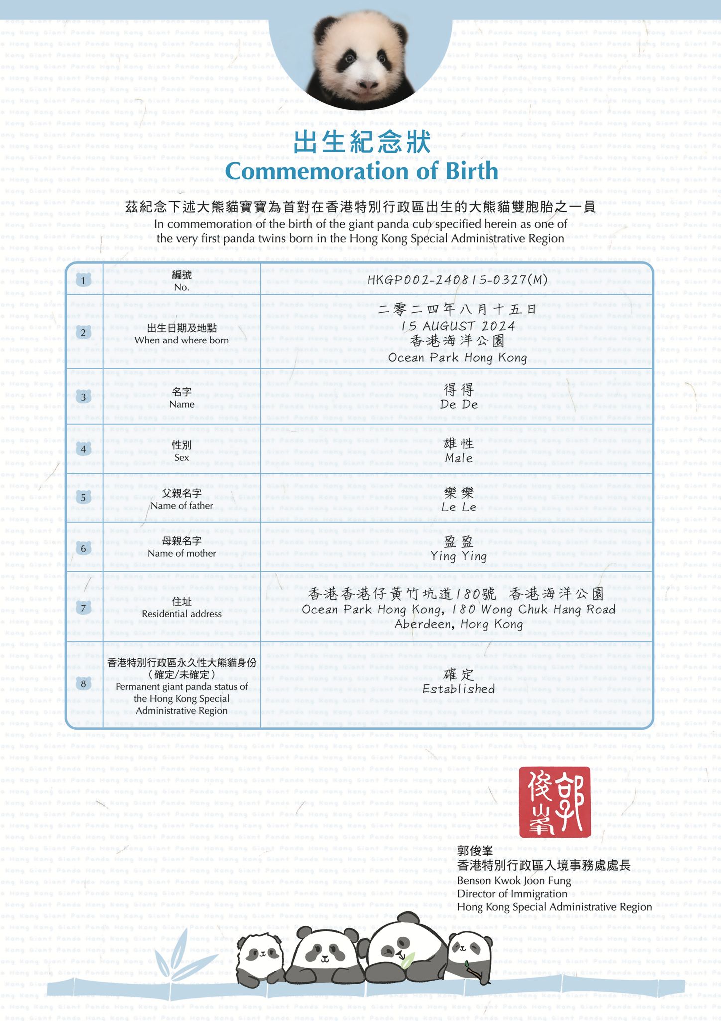 為了紀念首對大熊貓龍鳳胎在香港出生,郭處長昨天出席公布大熊貓名字儀式時,親自贈送了兩張「加加」和「得得」的「出生紀念狀」給海洋公園,上面還印有它們的照片、名字、出生日期、父母名字等資訊,還原度一百分,超級可愛。