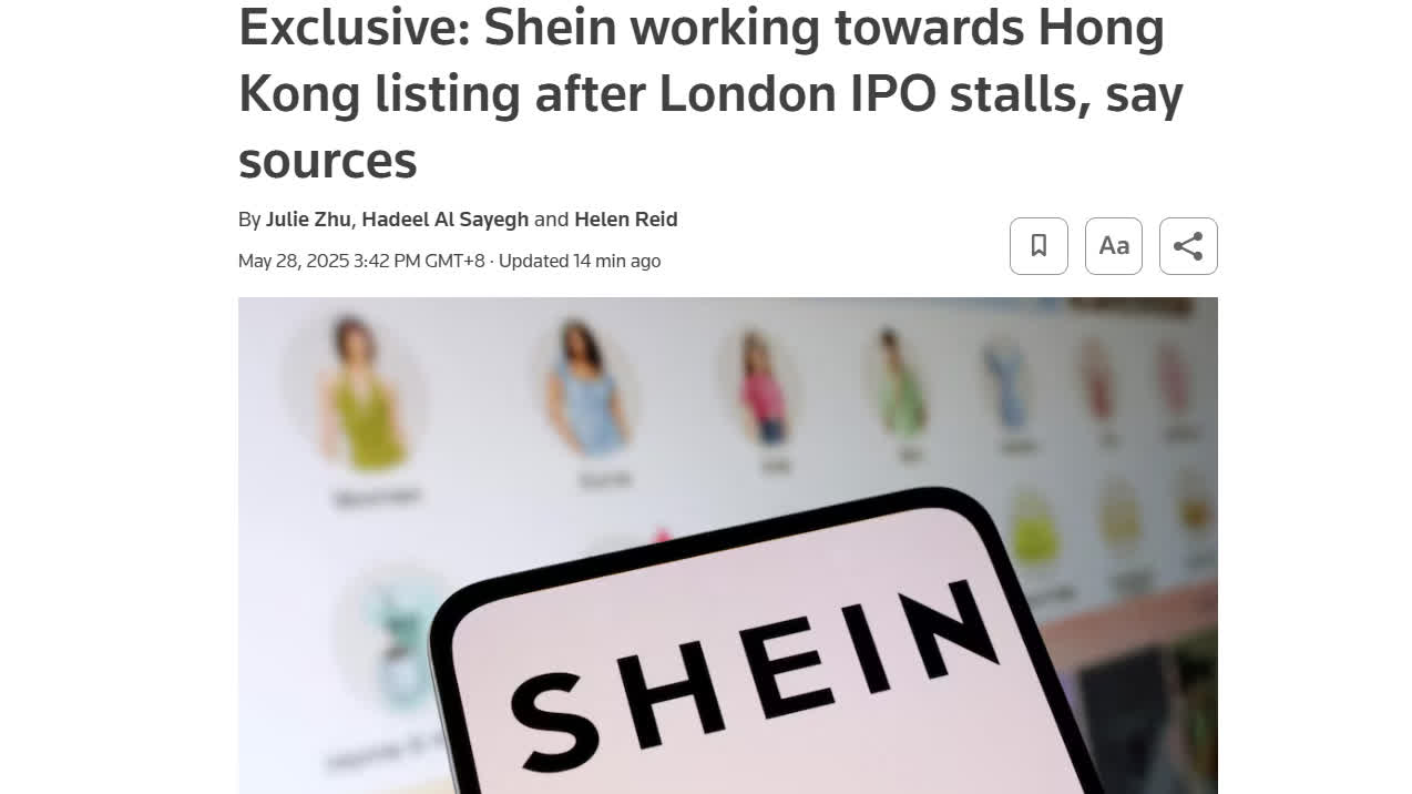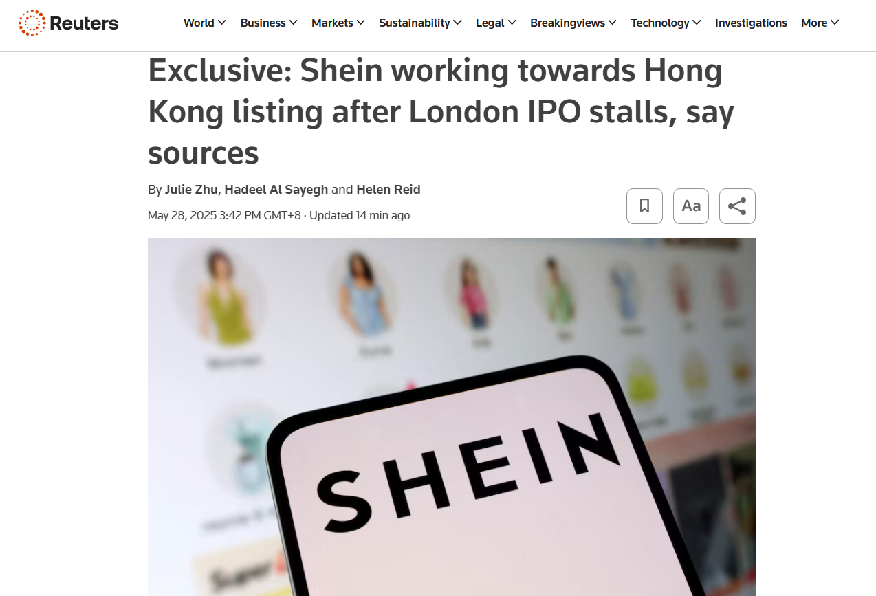 大公文匯全媒體報道,5月28日,據路透引述消息人士報道,服裝零售電商Shein在倫敦的上市計劃未獲批,Shein正考慮改為香港上市,將於未來幾星期提交招股說明書草案,計劃年內在香港掛牌。