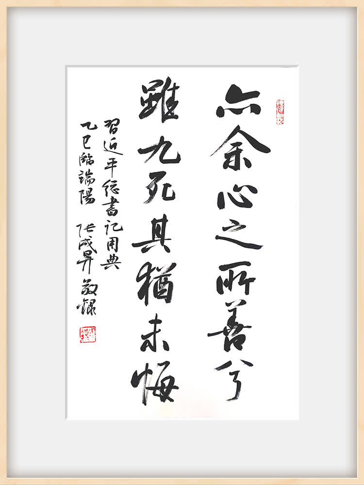 步入展廳,首先映入眼帘的是「路漫漫其修遠兮,吾將上下而求索」的巨幅書法作品,筆力雄渾,氣勢磅礴,生動詮釋了屈原對理想的執着追求。在新時代,這句經典名言激勵着無數中華兒女為實現中華民族偉大復興的中國夢而不懈奮鬥。展覽現場,所有作品均以習近平總書記引用的屈原名句為內容精心創作,一幅幅精美的書法作品,或蒼勁有力,或飄逸洒脫,以獨特的藝術視角,展現了屈原精神與紅色文化的深刻內涵。作者以筆為媒,以墨為介,將屈原「亦餘心之所善兮,雖九死其猶未悔」的堅定信念,與共產黨人「為中國人民謀幸福,為中華民族謀復興」的初心使命相呼應,深刻表達了對愛國主義精神的敬仰與傳承。這些作品不僅展現了書法藝術的魅力,更傳遞出強烈的紅色正能量,讓觀眾在欣賞藝術之美的同時,接受精神的洗禮。