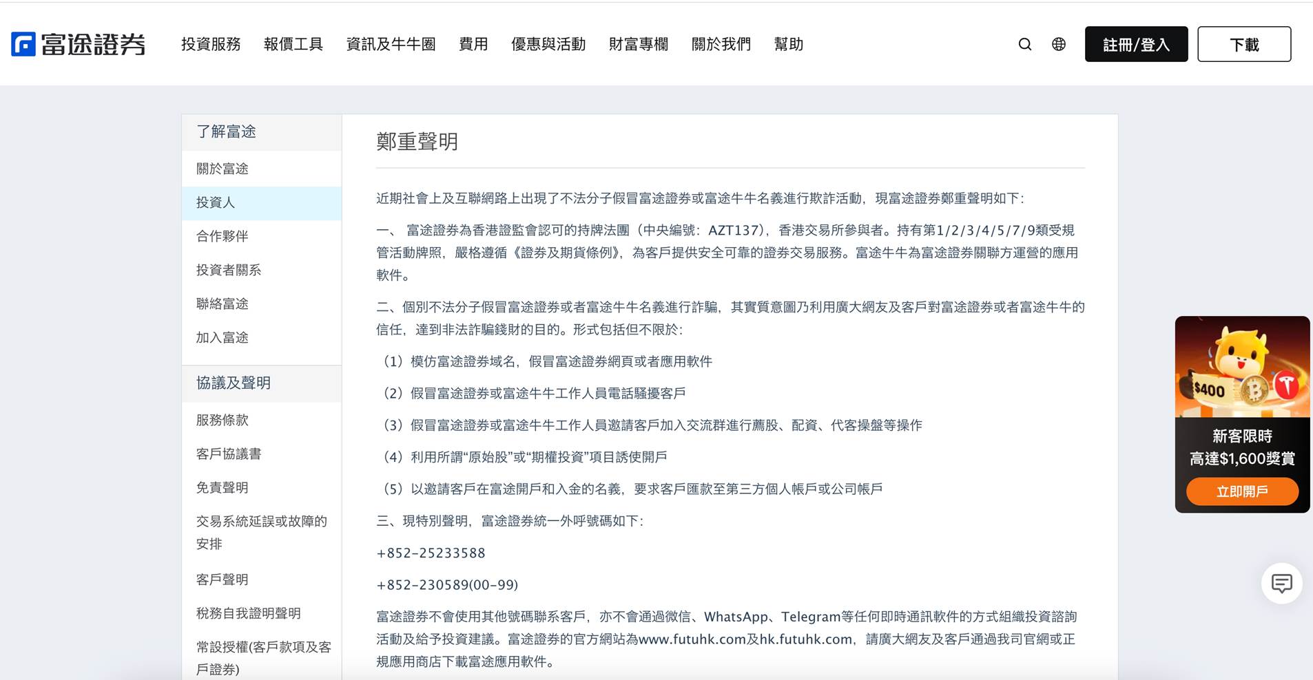 富途嚴正聲明,平台絕對不會通過短訊發送含連結的「更新資料」通知,所有此類訊息均屬詐騙。