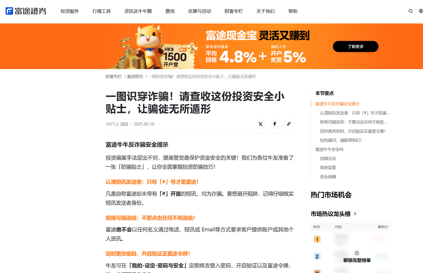 富途組織了專項人員跟進事件,加大了相關的用戶反詐騙宣導,向網絡安全部門進行舉報,並迅速採取可行的技術手段和安全措施幫助客戶對抗詐騙。舉例來說,富途牛牛在App的反欺詐專區、官方網站、官方社交平台及郵件等多渠道發布防詐騙信息;又在合規、安全的前提下盡力提供資料,積極配合警方調查等等。