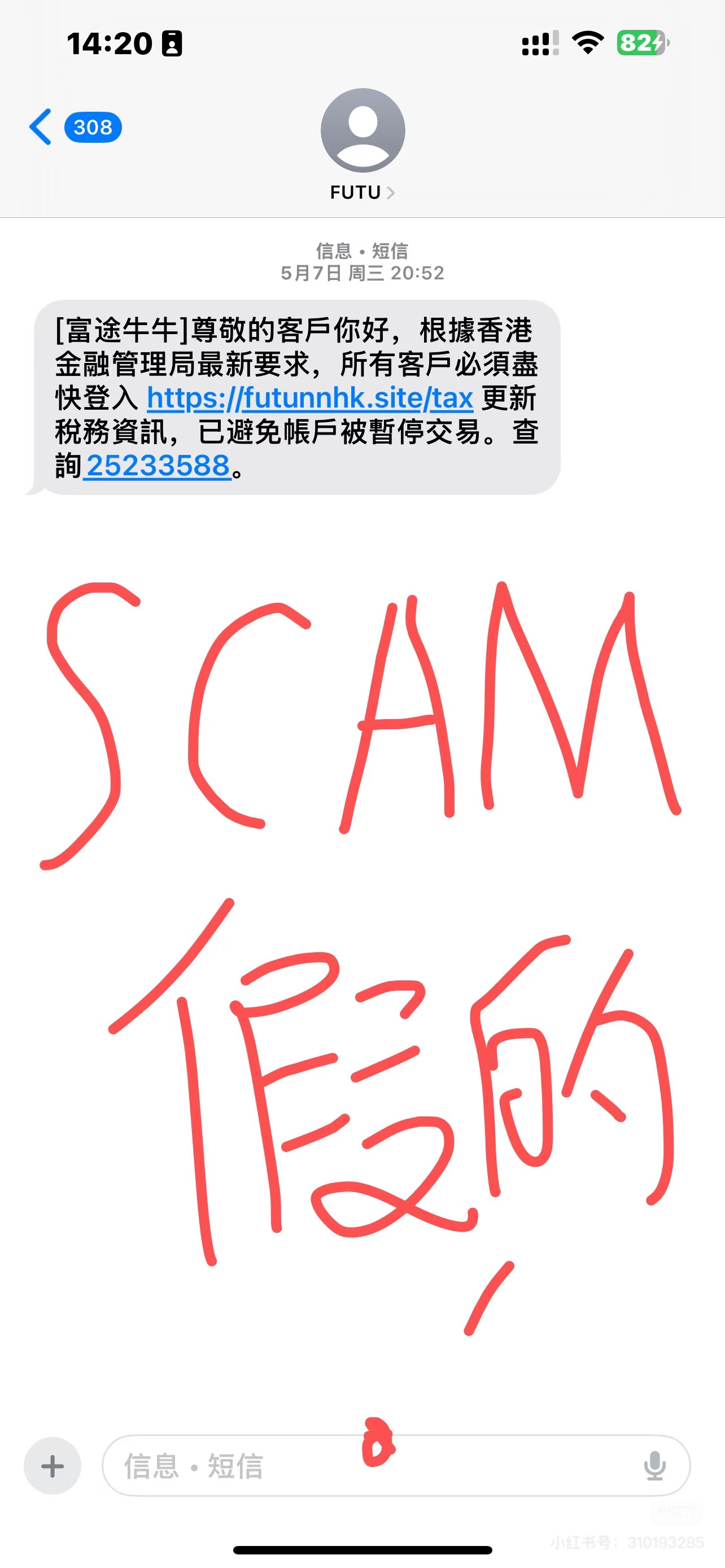 「看到短訊時,我第一反應是困惑!」小紅書博主樂先生向記者展示他於5月7日收到的詐騙短訊。內容聲稱「根據金管局最新要求,所有客戶必須盡快登入更新稅務資訊」。他說,連結網址藏有蹊蹺,「域名多了亂碼,網址和富途官網地址不符。」樂先生直言,近期抽新股的熱潮讓騙徒有機可乘,「幾天後就看到有人被騙走89萬,手法一模一樣!」