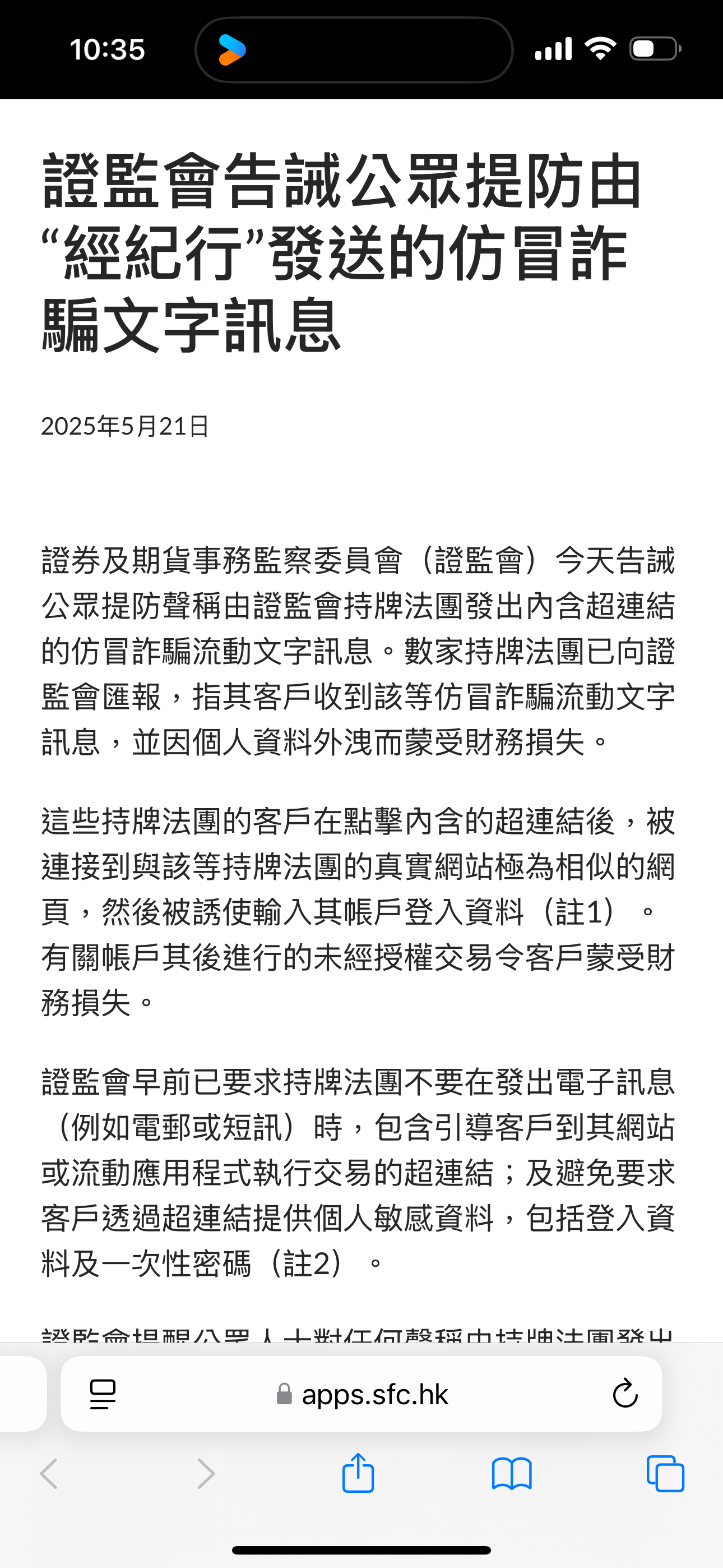 證監會亦在21日發文提醒公眾,持牌機構絕不會以短訊附連結要求輸入賬密,呼籲公眾遇到任何可疑連結都不要點擊,亦已要求券商避免在訊息中嵌入交易超連結。
