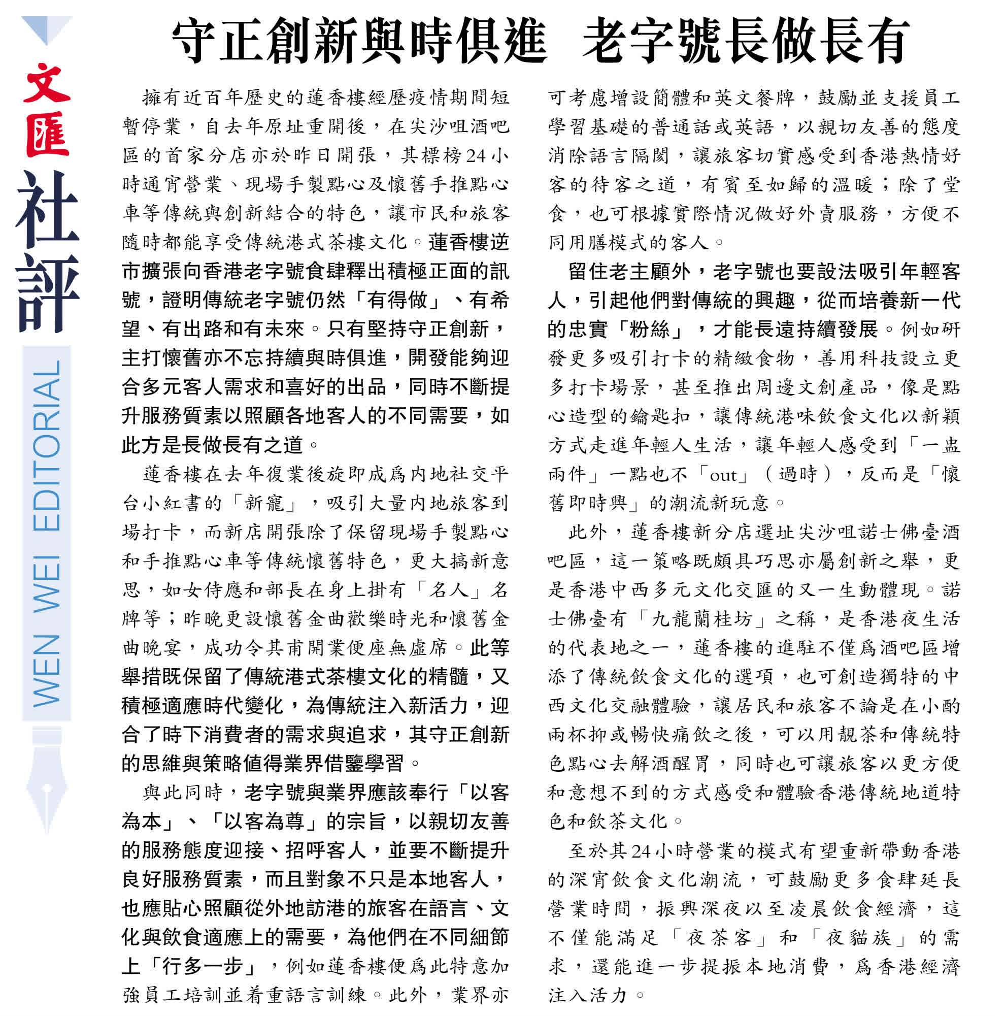擁有近百年歷史的蓮香樓經歷疫情期間短暫停業,自去年原址重開後,在尖沙咀酒吧區的首家分店亦於昨日開張,其標榜24小時通宵營業、現場手製點心及懷舊手推點心車等傳統與創新結合的特色,讓市民和旅客隨時都能享受傳統港式茶樓文化。蓮香樓逆市擴張向香港老字號食肆釋出積極正面的訊號,證明傳統老字號仍然「有得做」、有希望、有出路和有未來。只有堅持守正創新,主打懷舊亦不忘持續與時俱進,開發能夠迎合多元客人需求和喜好的出品,同時不斷提升服務質素以照顧各地客人的不同需要,如此方是長做長有之道。