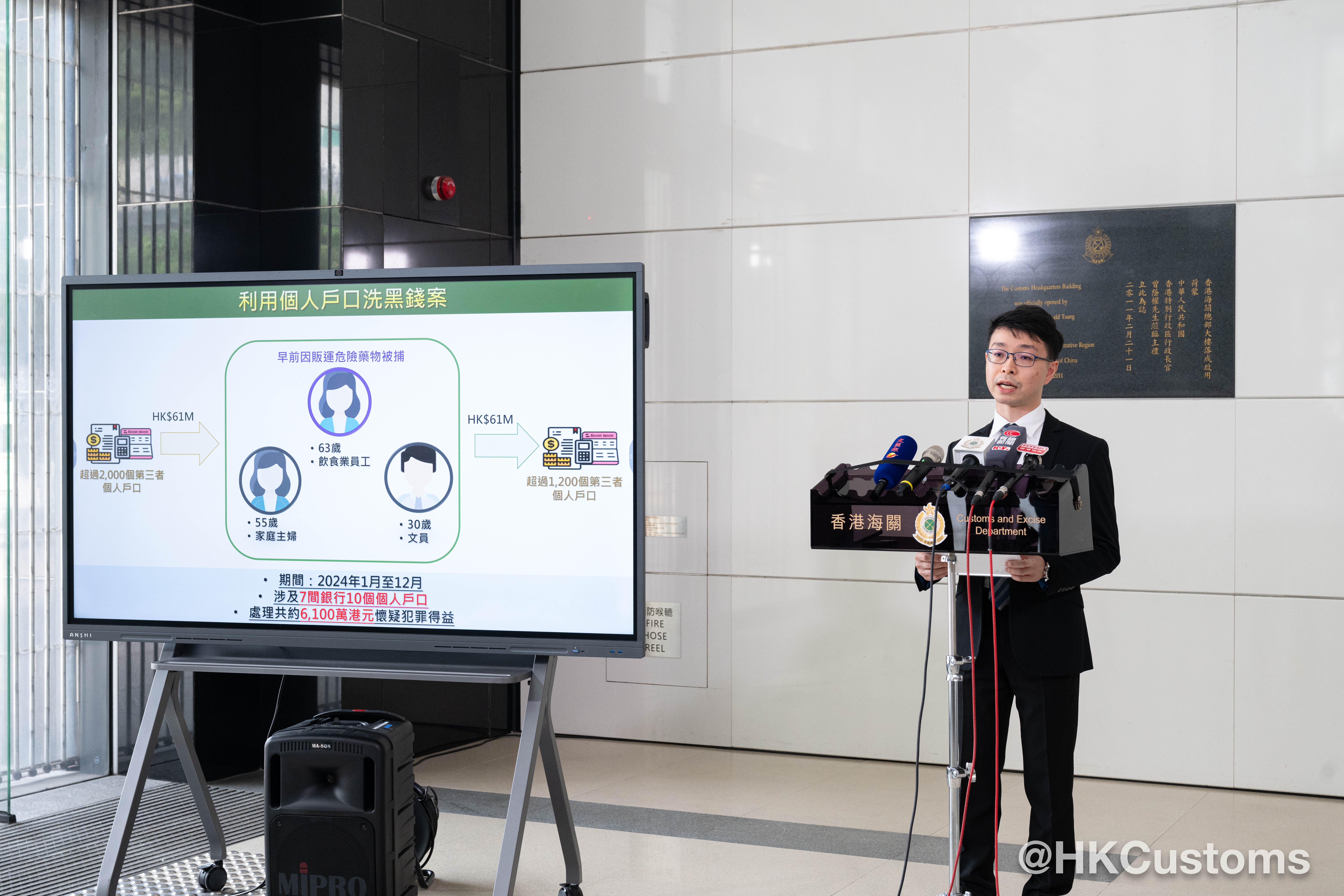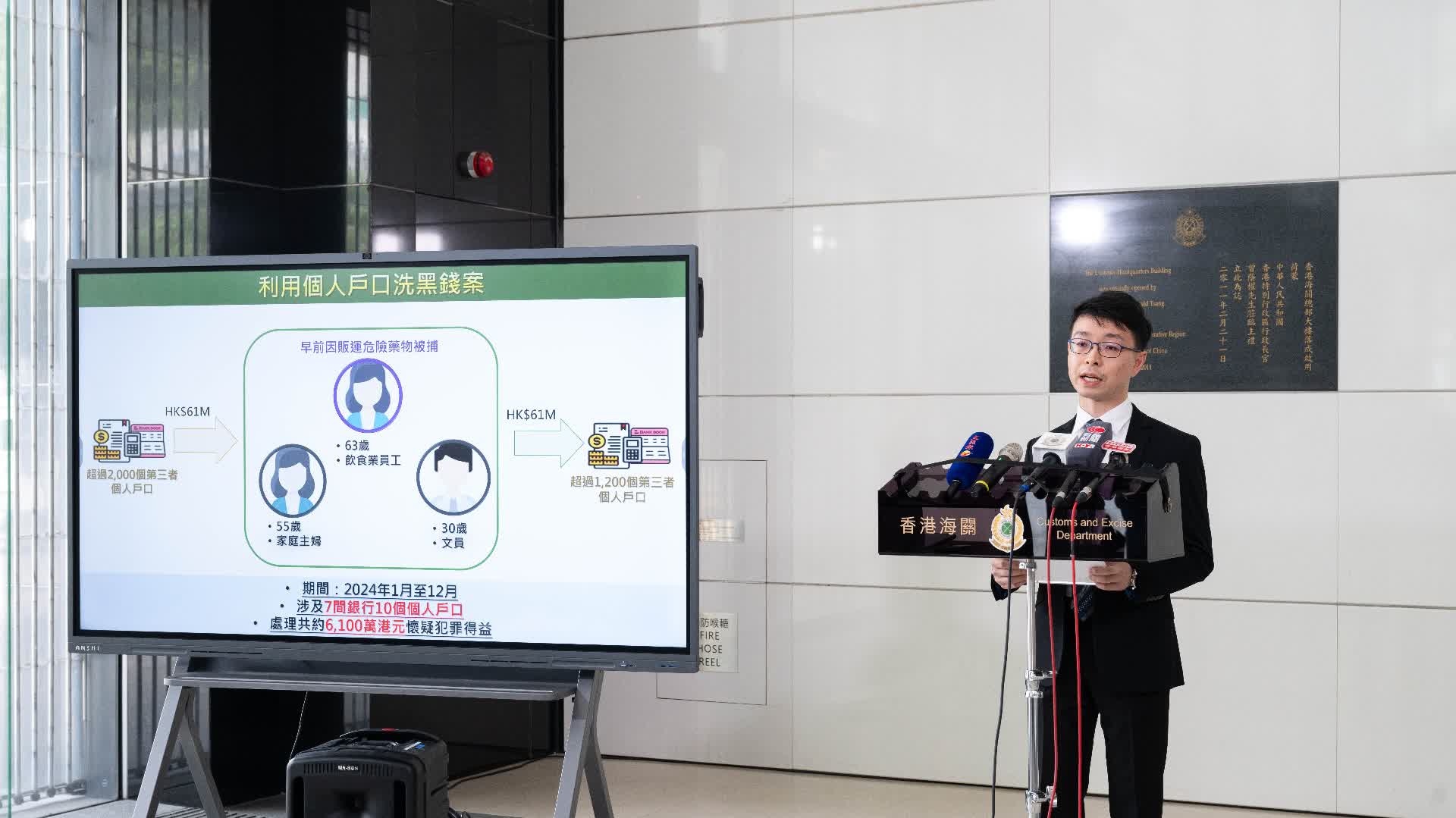 去年十月,海關偵破一宗涉及約一百九十萬元的毒品案件及拘捕兩名懷疑涉案人士。海關人員隨即展開財富調查,經資金流向分析後,發現其中一名被捕人士的個人銀行帳戶有大量懷疑涉及犯罪得益的可疑交易。同時,調查亦發現一名五十五歲本地女子及一名三十歲本地男子涉嫌轉帳或收取該些懷疑犯罪得益。在二○二四年一月至十二月期間,三名被捕人士處理的可疑交易涉款共約六千一百萬元。