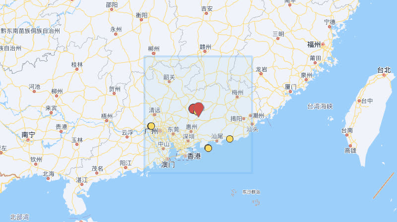 根據中國地震台網速報目錄,震中周邊200公里內近5年來發生3級以上地震共14次,最大地震是2023年3月8日在廣東河源市東源縣發生的4.5級地震(距離本次震中23公里)。