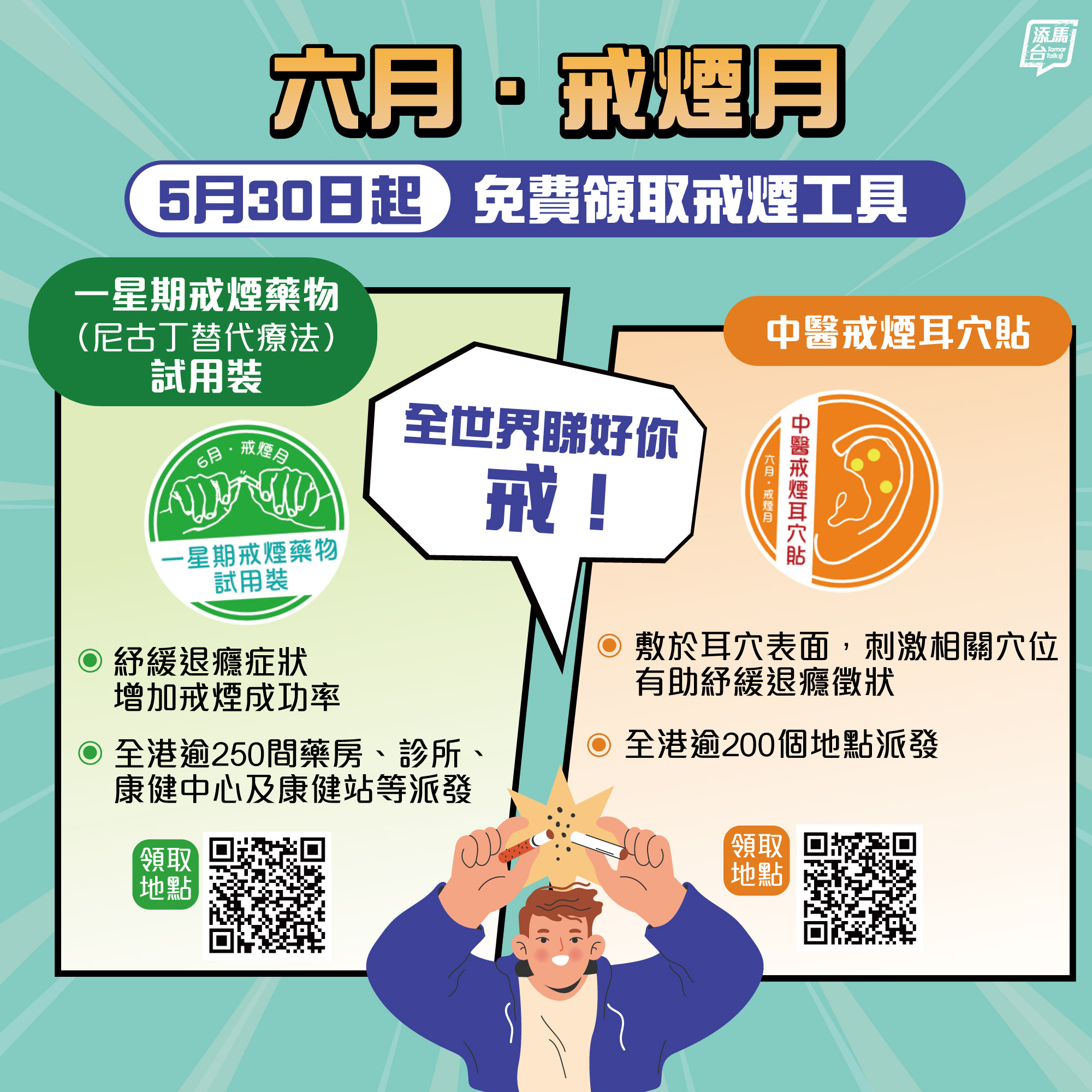 政府今日(29日)在社交專頁「添馬台」發文提醒,由明日(30日)起,有吸煙習慣人士可免費領取一星期戒煙藥物(尼古丁替代療法)試用裝,或中醫戒煙耳穴貼。戒煙人士只須前往貼有橙色「中醫戒煙耳穴貼」標誌或綠色「一星期戒煙藥物試用裝」標誌的地點,經簡單評估後,以「戒煙達人」應用程式掃描二維碼,便可以免費領取。