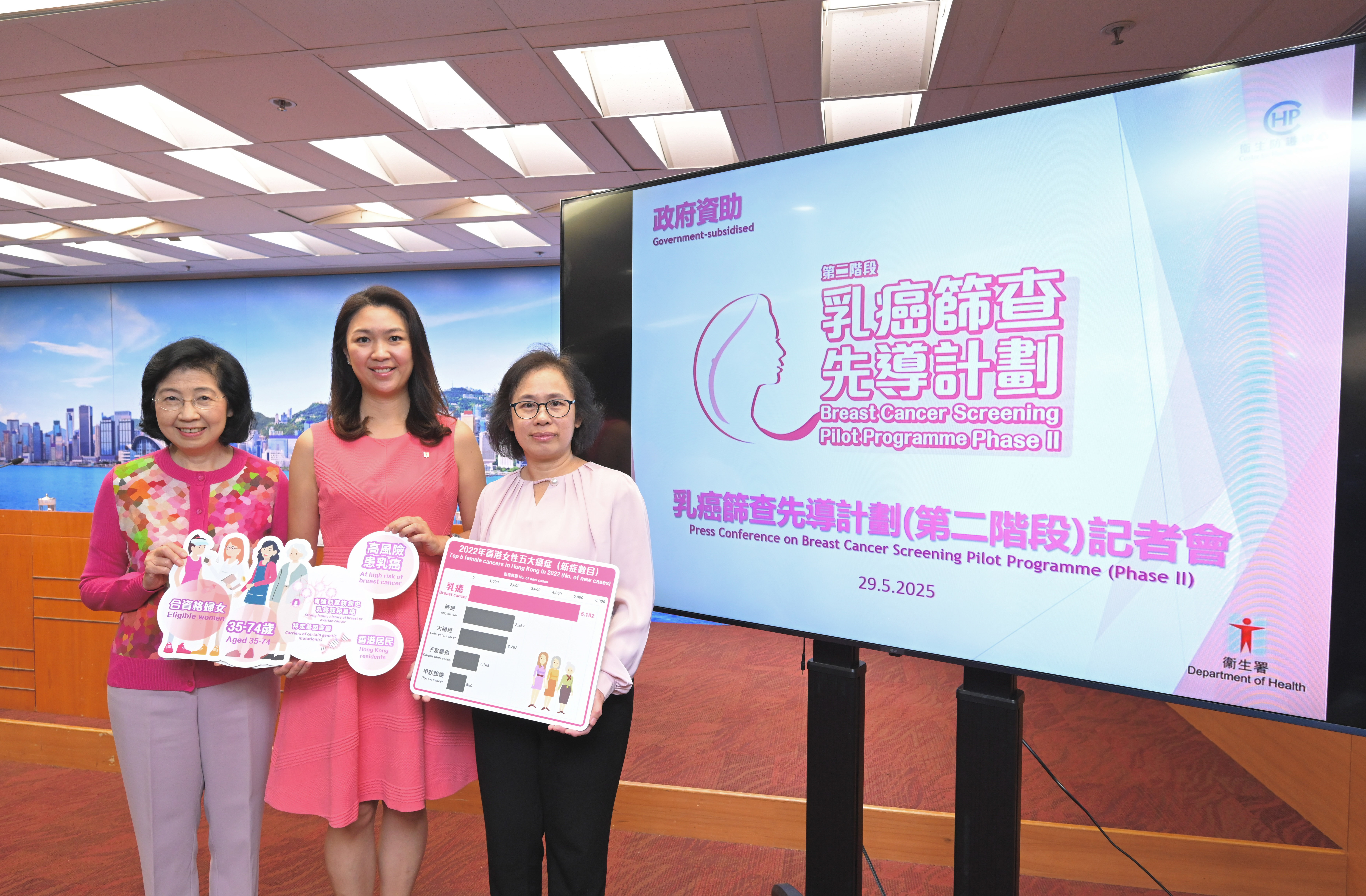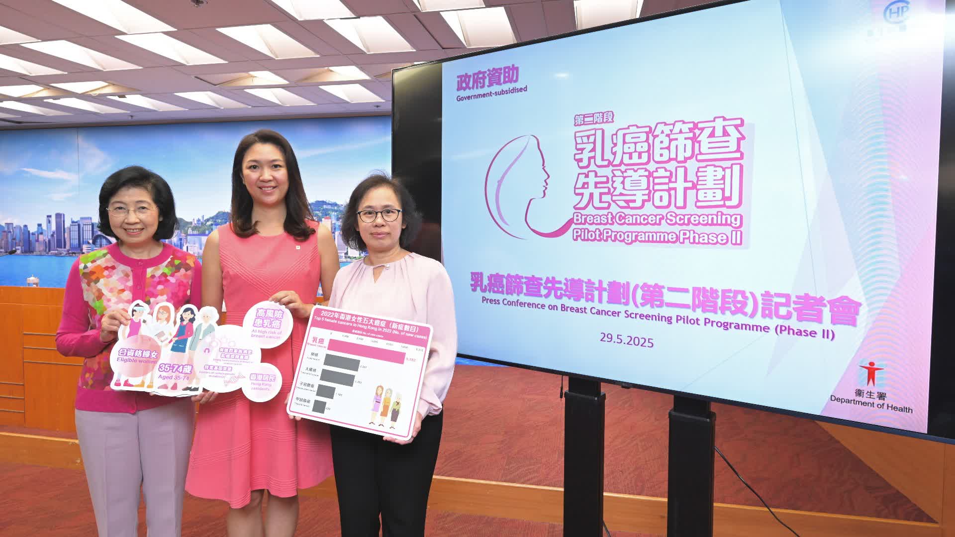 衞生署今日(五月二十九日)宣布,將於六月十日推出第二階段的乳癌篩查先導計劃(先導計劃),為年齡介乎35歲至74歲,並屬高風險罹患乳癌的香港女性居民提供資助篩查服務,以及早發現及治療,提升乳癌患者康復機會。